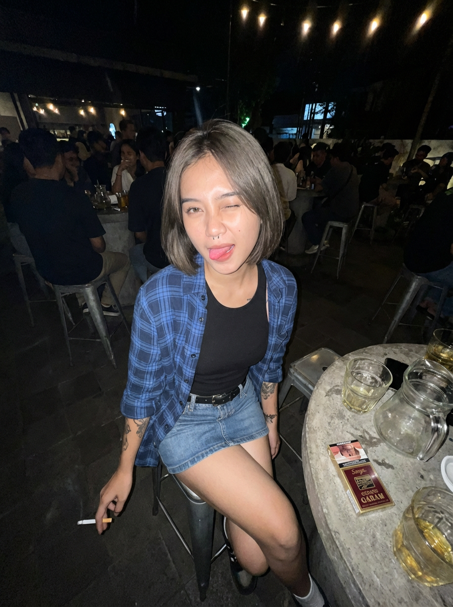 {"image_request": {"subject": {"demographics": "Young model, fair skin with natural blush, freckle-free nose and cheeks.", "hair": "Short ash-brown bob, center-parted layer, loose strands falling over face.", "facial_features": "Light brown eyes, curly eyelashes, soft pouty pink lips (glossy/plump), septum piercing.", "expression": "Playful, mischievous, cute, winking and sticking out tongue.", "tattoos": "Preserve subject's original tattoos (visible on skin/face/hands)."}, "apparel": {"upper_body": "Black tank top, light blue, white, and black plaid flannel shirt (worn open or draped).", "lower_body": "Denim miniskirt.", "accessories": "Small black belt."}, "pose_and_action": {"posture": "Sitting casually on a bar stool.", "hands": "Left hand relaxed and down, holding a lit cigarette."}, "environment": {"setting": "Dark outdoor/semi-outdoor bar, pub, or nightclub.", "furniture": "Round tables with stone/metal texture, bar stools.", "background_elements": "Faintly visible people sitting in the background, nighttime atmosphere."}, "props": {"table_items": ["Glass glasses filled with drinks", "Glass pitcher", "Cigarette pack (Gudang Garam Surya 16 styling)"]}, "technical_specifications": {"angle": "High Angle Shot (looking down at subject).", "lighting": "Harsh direct flash, sharp shadows behind subject, skin appears bright/slightly overexposed.", "style": "Casual snapshot, Y2k aesthetic, streetwear vibe, grunge, flash photography.", "resolution": "1200x1200px"}}}