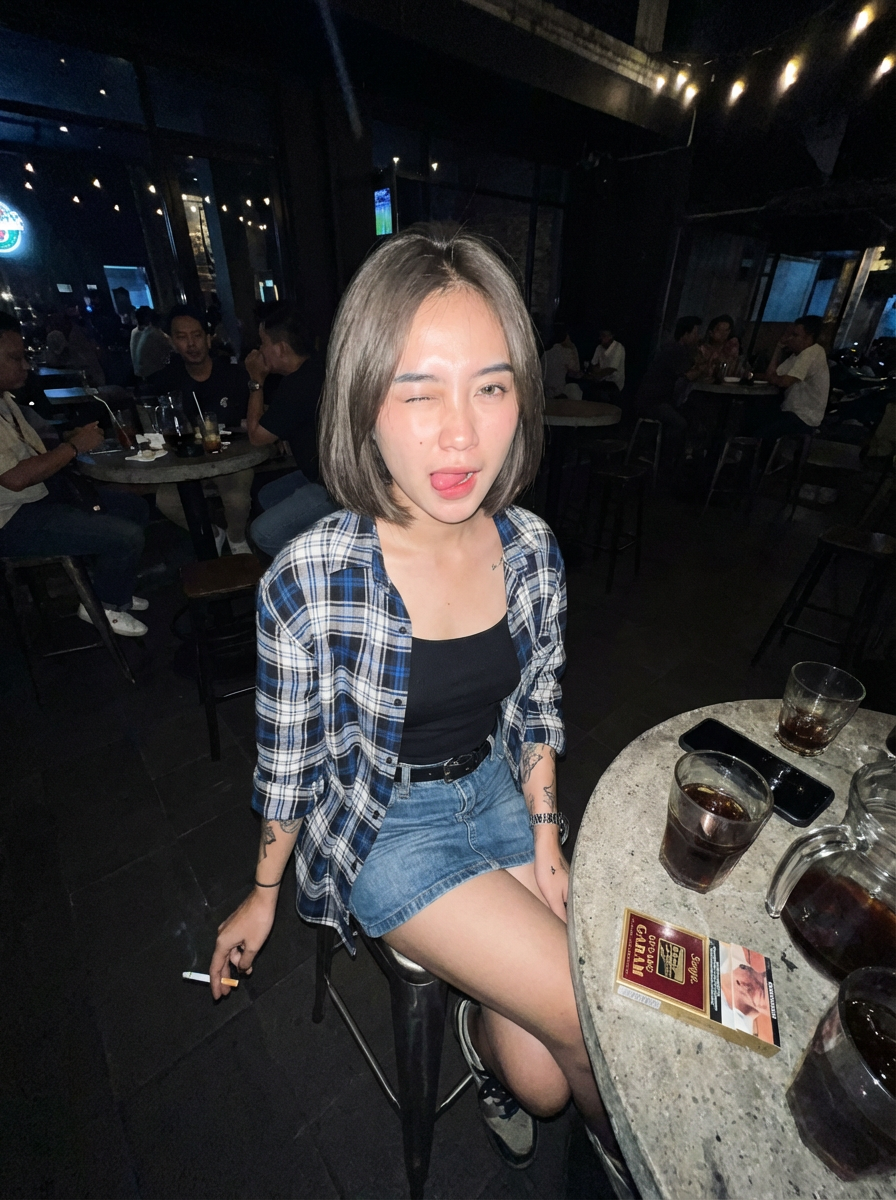{"image_request": {"subject": {"demographics": "Young model, fair skin with natural blush, freckle-free nose and cheeks.", "hair": "Short ash-brown bob, center-parted layer, loose strands falling over face.", "facial_features": "Light brown eyes, curly eyelashes, soft pouty pink lips (glossy/plump), septum piercing.", "expression": "Playful, mischievous, cute, winking and sticking out tongue.", "tattoos": "Preserve subject's original tattoos (visible on skin/face/hands)."}, "apparel": {"upper_body": "Black tank top, light blue, white, and black plaid flannel shirt (worn open or draped).", "lower_body": "Denim miniskirt.", "accessories": "Small black belt."}, "pose_and_action": {"posture": "Sitting casually on a bar stool.", "hands": "Left hand relaxed and down, holding a lit cigarette."}, "environment": {"setting": "Dark outdoor/semi-outdoor bar, pub, or nightclub.", "furniture": "Round tables with stone/metal texture, bar stools.", "background_elements": "Faintly visible people sitting in the background, nighttime atmosphere."}, "props": {"table_items": ["Glass glasses filled with drinks", "Glass pitcher", "Cigarette pack (Gudang Garam Surya 16 styling)"]}, "technical_specifications": {"angle": "High Angle Shot (looking down at subject).", "lighting": "Harsh direct flash, sharp shadows behind subject, skin appears bright/slightly overexposed.", "style": "Casual snapshot, Y2k aesthetic, streetwear vibe, grunge, flash photography.", "resolution": "1200x1200px"}}}