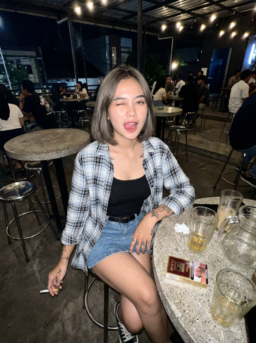 {"image_request": {"subject": {"demographics": "Young model, fair skin with natural blush, freckle-free nose and cheeks.", "hair": "Short ash-brown bob, center-parted layer, loose strands falling over face.", "facial_features": "Light brown eyes, curly eyelashes, soft pouty pink lips (glossy/plump), septum piercing.", "expression": "Playful, mischievous, cute, winking and sticking out tongue.", "tattoos": "Preserve subject's original tattoos (visible on skin/face/hands)."}, "apparel": {"upper_body": "Black tank top, light blue, white, and black plaid flannel shirt (worn open or draped).", "lower_body": "Denim miniskirt.", "accessories": "Small black belt."}, "pose_and_action": {"posture": "Sitting casually on a bar stool.", "hands": "Left hand relaxed and down, holding a lit cigarette."}, "environment": {"setting": "Dark outdoor/semi-outdoor bar, pub, or nightclub.", "furniture": "Round tables with stone/metal texture, bar stools.", "background_elements": "Faintly visible people sitting in the background, nighttime atmosphere."}, "props": {"table_items": ["Glass glasses filled with drinks", "Glass pitcher", "Cigarette pack (Gudang Garam Surya 16 styling)"]}, "technical_specifications": {"angle": "High Angle Shot (looking down at subject).", "lighting": "Harsh direct flash, sharp shadows behind subject, skin appears bright/slightly overexposed.", "style": "Casual snapshot, Y2k aesthetic, streetwear vibe, grunge, flash photography.", "resolution": "1200x1200px"}}}