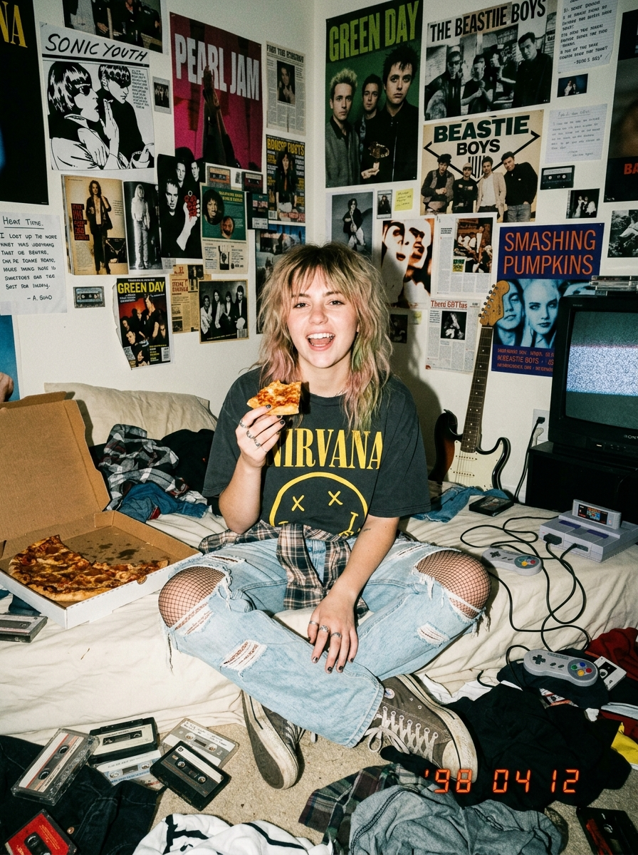 {"image_request":{"goal":"90s Grunge Aesthetic bedroom snapshot, maximalist messy composition, flash photography, featuring a teen rocker in a cluttered room","meta":{"image_type":"Candid Snapshot \/ Flash Photography \/ Grunge Aesthetic \/ Lifestyle \/ Period Piece","quality":"Raw, Authentic, Film Grain, Analog Feel, Detailed Clutter","color_mode":"Warm Tungsten mixed with harsh flash, slightly faded vintage colors","style_mode":"retro_analog_candid","aspect_ratio":"4:5","resolution":"1440x1920"},"creative_style":"Teenage angst, Nirvana era grunge, messy maximalism, unpolished authenticity, polaroid aesthetic, disposable camera vibe, rebellious youth culture, intimate chaos","overall_theme":"teenage rebellion \/ cozy chaos \/ nostalgic 90s \/ music lover \/ messy lifestyle","mood_vibe":"rebellious \/ cozy \/ lazy \/ messy \/ nostalgic \/ energetic \/ carefree","style_keywords":["90s grunge","cluttered bedroom","flash photography","band posters","pizza","flannel shirt","ripped jeans","electric guitar","vintage gaming","film grain","analog"],"subject":{"count":"1","type":"model","identity":"Cool grunge teenager, hair, attitude","identity_preservation":{"description":"Preserve the 'too cool to care' attitude and candid expression","notes":"Looks like a friend took the photo."},"age_appearance":"late teens \/ 19 years old","skin":"natural texture, maybe slight imperfections, pale","makeup":{"lips":"dark berry or brown lipstick (90s style)","eyes":"smudged eyeliner","general":"messy, lived-in make-up.p"},"facial_features":{"expression":"laughing mid-sentence or bored chewing gum","eyes":{"gaze":"looking at the camera or distracted by a game","intensity":"playful or bored"},"lips":{"gesture":"chewing gum, bubbling, or smiling"}},"hair":{"length":"shoulder length, messy shag cut","texture":"bleached, slightly frizzy, dyed pink or green tips","style":"bedhead, unkempt","lighting_interaction":{"light":"flash reflection on oily roots","shadow_play":"harsh shadow behind head"}},"clothing":{"top":"oversized vintage band t-shirt (e.g., Nirvana\/Sonic Youth)","bottom":"light wash ripped baggjeans\/fishnetsts underneath","full_description":"Classic grunge layering: Oversized band tee, flannel shirt tied around waist, ripped jeans, dirty Converse All-Star sneakers","accessories":"choker necklace, silver rings, chipped nail polish"},"props":{"guitar":"Fender Stratocaster leaning on bed","food":"open pizza box on bed","tech":"Super Nintendo console, CRT TV, scattered cassette tapes","decor":"Christmas lights, wall covered in magazine cutouts"}},"pose_action":{"description":"Sitting cross-legged on a messy bed or sprawling on the floor","overall_pose":"relaxed, slouching, dynamic","head_turn":"facing camera","gaze":"direct flash eye contact","body_position":"slumped comfortably","hands":"holding a pizza slice or game controller","movement":"frozen moment candid"},"multiple_frames_expressions":["N\/A"],"environment":{"setting":"Teenager's Bedroom 1990s","location":"indoors, small cluttered room","weather":"indoor night","time_of_day":"night time hangout","atmosphere":"stuffy, cozy, smell of teen spirit"},"background":{"color":"busy multicolored walls","effect":"cluttered depth, walls covered in posters and collage"},"lighting":{"type":"On-camera direct flash + ambient warm lamps","position":"front direct","direction":"flat flash","intensity":"harsh foreground, dark corners","focus":"sharp center","falloff":"vignette darkness at edges","light_quality":"hard, artificial, disposable camera look","source":"camera flash","tone":"warm ambient vs cool flash","mood":"fun chaotic night","subject_lighting":"brightly lit by flash, washed out slightly","environment_lighting":"warm fairy lights in background","color_temperature":"mixed","contrast_shadow":"hard drop shadow behind subject","shadow_quality":"sharp and distinct","imperfections":["red eye effect","dust particles in flash","motion blur on hands"]},"camera":{"sensor_format":"35mm Film Point-and-Shoot (e.g., Olympus Stylus)","lens":"35mm fixed lens","position_angle":"slightly high angle (standing friend POV)","distance":"full body sitting","framing":"loose framing to show the room clutter","depth_of_field":"deep depth of field (flash sync), everything mostly in focus","composition":{"framing":"snapshot style, slightly tilted","depth":"busy foreground and background","emphasis":"the chaos of the room and the subject","angle":"casual snap"}},"scene_specific_details":{"clutter_level":"MAXIMALIST. Every inch of the frame should have detail (clothes on the floor, open drawers, posters).","texture_focus":"Paper posters, denim fabric, greasy pizza, fuzzy blankets.","layout":"Chaotic, no negative space.","border":"N\/A","tonality_texture":"heavy film grain, Kodak Gold 200 emulation","highlight_behavior":"flash glare on posters and TV screen"},"color_grading":{"palette":"Desaturated denim blue, flannel red, warm tungsten yellow, flash white","lut":"Kodak Gold 200 \/ Vintage Analog","mood":"nostalgic grunge"},"post_processing":{"sharpening":"medium, natural film sharpness","final_touch":"add dust and scratches overlay, date stamp '98 04 12' in corner"},"negative":{"style":"clean, modern minimalism, HD digital, studio lighting, soft box, bokeh, 3D render, glossy","content":"clean room, empty walls, modern smartphone, flatscreen TV, LED strips, luxury furniture","artifacts":"digital smoothing, plastic skin"},"additional_controls":{"focus_emphasis":"The authentic feeling of a messy teen bedroom","grounding":"Subject interacts physically with the mess","special_notes":"Needs to look like a found photo from 1995. Not a staged photoshoot.","vibe":"smells like teen spirit","final_output_goal":"A hyper-authentic 90s flashback image that feels noisy, messy, and real."}}}
