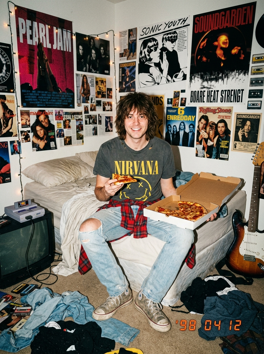 {"image_request":{"goal":"90s Grunge Aesthetic bedroom snapshot, maximalist messy composition, flash photography, featuring a rocker in a cluttered room","meta":{"image_type":"Candid Snapshot \/ Flash Photography \/ Grunge Aesthetic \/ Lifestyle \/ Period Piece","quality":"Raw, Authentic, Film Grain, Analog Feel, Detailed Clutter","color_mode":"Warm Tungsten mixed with harsh flash, slightly faded vintage colors","style_mode":"retro_analog_candid","aspect_ratio":"4:5","resolution":"1440x1920"},"creative_style":" angst, Nirvana era grunge, messy maximalism, unpolished authenticity, polaroid aesthetic, disposable camera vibe, rebellious culture, chaos","overall_theme":" rebellion \/ cozy chaos \/ nostalgic 90s \/ music lover \/ messy lifestyle","mood_vibe":"rebellious \/ cozy \/ lazy \/ messy \/ nostalgic \/ energetic \/ carefree","style_keywords":["90s grunge","cluttered bedroom","flash photography","band posters","pizza","flannel shirt","ripped jeans","electric guitar","vintage gaming","film grain","analog"],"subject":{"count":"1","type":"model","identity":"Cool grunge guy, messy hair, attitude","identity_preservation":{"description":"Preserve the 'too cool to care' attitude and candid expression","notes":"Looks like a friend took the photo."},"age_appearance":"late \/ 19 years old","skin":"natural texture, maybe slight imperfections, pale, light stubble","makeup":{"lips":"natural features (90s style)","eyes":"hooded and intense","general":"clean groomed skin, lived-in grunge look"},"facial_features":{"expression":"laughing mid-sentence or bored chewing gum","eyes":{"gaze":"looking at the camera or distracted by a game","intensity":"playful or bored"},"lips":{"gesture":"chewing gum, bubbling, or smirking"}},"hair":{"length":"medium length, messy cut","texture":"bleached, slightly frizzy, dyed pink or green tips","style":"bedhead, unkempt","lighting_interaction":{"light":"flash reflection on oily roots","shadow_play":"harsh shadow behind head"}},"clothing":{"top":"oversized vintage band t-shirt (e.g., Nirvana\/Sonic )","bottom":"light wash ripped baggy jeans","full_description":"Classic grunge layering: Oversized band tee, flannel shirt tied around waist, ripped jeans, dirty Converse All-Star sneakers","accessories":"chunky chain necklace, silver rings"},"props":{"guitar":"Fender Stratocaster leaning on bed","food":"open pizza box on bed","tech":"Super Nintendo console, CRT TV, scattered cassette tapes","decor":"Christmas lights, wall covered in magazine cutouts"}},"pose_action":{"description":"Sitting cross-legged on a messy bed or sprawling on the floor","overall_pose":"relaxed, slouching, dynamic","head_turn":"facing camera","gaze":"direct flash eye contact","body_position":"slumped comfortably","hands":"holding a pizza slice or game controller","movement":"frozen moment candid"},"multiple_frames_expressions":["N\/A"],"environment":{"setting":" 's Bedroom 1990s","location":"indoors, small cluttered room","weather":"indoor night","time_of_day":"night time hangout","atmosphere":"stuffy, cozy, smell of spirit"},"background":{"color":"busy multicolored walls","effect":"cluttered depth, walls covered in posters and collage"},"lighting":{"type":"On-camera direct flash + ambient warm lamps","position":"front direct","direction":"flat flash","intensity":"harsh foreground, dark corners","focus":"sharp center","falloff":"vignette darkness at edges","light_quality":"hard, artificial, disposable camera look","source":"camera flash","tone":"warm ambient vs cool flash","mood":"fun chaotic night","subject_lighting":"brightly lit by flash, washed out slightly","environment_lighting":"warm lights in background","color_temperature":"mixed","contrast_shadow":"hard drop shadow behind subject","shadow_quality":"sharp and distinct","imperfections":["red eye effect","dust particles in flash","motion blur on hands"]},"camera":{"sensor_format":"35mm Film Point-and-Shoot (e.g., Olympus Stylus)","lens":"35mm fixed lens","position_angle":"slightly high angle (standing friend POV)","distance":"full body sitting","framing":"loose framing to show the room clutter","depth_of_field":"deep depth of field (flash sync), everything mostly in focus","composition":{"framing":"snapshot style, slightly tilted","depth":"busy foreground and background","emphasis":"the chaos of the room and the subject","angle":"casual snap"}},"scene_specific_details":{"clutter_level":"MAXIMALIST. Every inch of the frame should have detail (clothes on the floor, open drawers, posters).","texture_focus":"Paper posters, denim fabric, greasy pizza, fuzzy blankets.","layout":"Chaotic, no negative space.","border":"N\/A","tonality_texture":"heavy film grain, Kodak Gold 200 emulation","highlight_behavior":"flash glare on posters and TV screen"},"color_grading":{"palette":"Desaturated denim blue, flannel red, warm tungsten yellow, flash white","lut":"Kodak Gold 200 \/ Vintage Analog","mood":"nostalgic grunge"},"post_processing":{"sharpening":"medium, natural film sharpness","final_touch":"add dust and scratches overlay, date stamp '98 04 12' in corner"},"negative":{"style":"clean, modern minimalism, HD digital, studio lighting, soft box, bokeh, 3D render, glossy","content":"clean room, empty walls, modern smartphone, flatscreen TV, LED strips, luxury furniture","artifacts":"digital smoothing, plastic skin"},"additional_controls":{"focus_emphasis":"The authentic feeling of a messy bedroom","grounding":"Subject interacts physically with the mess","special_notes":"Needs to look like a found photo from 1995. Not a staged photoshoot.","vibe":"smells like spirit","final_output_goal":"A hyper-authentic 90s flashback image that feels noisy, messy, and real."}}}