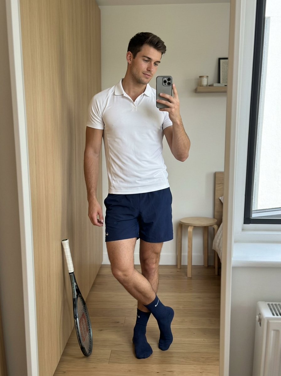 {"image_request":{"goal":"Create an ultra-authentic hyperrealistic mirror selfie \/ fitness influencer aesthetic \/ cozy minimalist interior \/ casual fit check \/ soft daylight beauty with a tennis outfit","meta":{"image_type":"Hyperrealistic Mirror Selfie \/ Influencer Lifestyle \/ Minimalist Indoor Portrait","quality":"8K, Ultra-HD, Masterpiece, Best Quality, Ultra-Detailed, Hyperrealistic","color_mode":"Full Color (natural, soft warm tones)","style_mode":"raw_photoreal \/ high-fashion luxury lifestyle \/ authentic social media content","aspect_ratio":"4:5","resolution":"1080x1350px"},"creative_style":"Contemporary influencer lifestyle with soft natural lighting, minimalist interior design aesthetics, focus on athletic physique and tennis fashion details, authentic mirror selfie composition","overall_theme":"casual fitness confidence \/ tennis aesthetic \/ minimalist home vibe \/ cozy morning light","mood_vibe":"serene confidence \/ relaxed \/ playful \/ aesthetic \/ cozy","style_keywords":["mirror selfie","tennis aesthetic","athletic fit","minimalist interior","natural light","iPhone photography","high fidelity","social media style","clean model aesthetic"],"subject":{"count":"1","type":"model","identity":"stunning young model, early 20s, athletic muscular build, toned core, short straight jet-black hair","identity_preservation":{"description":"Preserve fit athletic body type, jet-black hair texture, and casual confident expression","notes":"Tennis-ready styling, clean influencer realism."},"age_appearance":"early 20s","skin":"healthy glow, realistic skin texture with natural muscle definition (subtle abdominal shading), light stubble","makeup":{"lips":"natural","eyes":"natural features makeup with defined eyes","general":"well-groomed appearance smoky look (still realistic, not heavy stage makeup)"},"facial_features":{"expression":"confident gaze at phone screen \/ relaxed","eyes":{"gaze":"directed at phone screen in reflection","intensity":"focused but relaxed"},"lips":{"gesture":"relaxed"}},"hair":{"length":"short","texture":"straight to slight wave, silky, jet black","style":"tousled and textured over forehead","lighting_interaction":{"light":"soft natural highlights from window","shadow_play":"gentle shadows giving volume"}},"clothing":{"top":"tennis-appropriate fitted athletic shirt (sporty, breathable, clean minimal design)","bottom":"tailored tennis shorts (mid- length, clean lines, modest)","full_description":"a clean, sporty tennis outfit: fitted athletic shirt + tailored tennis shorts; no underwear; tasteful athletic styling","accessories":"ankle or crew socks (clean sporty), optional subtle small pattern"},"props":{"bouquet":"N\/A","wine_glass":"N\/A","other":"iPhone Pro in grey case held in hand, wooden cylindrical stool, vase with colorful Lego-style botanical flowers on floor, optional tennis racket leaning against wall (subtle, not dominant)"}},"pose_action":{"description":"Standing full-body mirror selfie leaning slightly back","overall_pose":"leaning back against a tall wooden cylindrical table\/stool, legs crossed at ankles, relaxed athletic stance","head_turn":"slight tilt to the left","gaze":"looking at phone screen in a mirror","body_position":"weight resting on support, elongating in a natural athletic pose","hands":"one hand holding phone up covering part of face, other arm relaxed at side or resting lightly near hip","movement":"static pose"},"environment":{"setting":"clean minimalist bedroom or living area \/ bright apartment","location":"indoor, in front of a large full-length mirror","weather":"N\/A (indoor)","time_of_day":"daytime \/ soft morning light","atmosphere":"calm, clean, airy, private"},"background":{"color":"walls, light wood tones","effect":"reflection showing room depth, door in background, light wood flooring"},"lighting":{"type":"soft natural diffuse light","position":"side\/window source (off-screen)","direction":"soft wash from right side","intensity":"moderate, flattering","focus":"highlighting face and natural athletic definition","falloff":"gradual, soft shadows","light_quality":"diffuse daylight 5500K","source":"large window reflection implied","tone":"natural neutrals","mood":"effortless chic","subject_lighting":"soft uneven wash accentuating natural definition","environment_lighting":"ambient daylight filling the room","color_temperature":"neutral daylight","contrast_shadow":"soft contrast, definition in mid-tones","shadow_quality":"soft, natural","imperfections":["mirror surface dust","slight phone reflection artifacts"]},"camera":{"sensor_format":"smartphone sensor simulation \/ digital","lens":"wide angle smartphone lens (approx 24-26mm equivalent)","position_angle":"eye-level reflection","distance":"arm's length\/selfie distance","framing":"vertical full body shot capturing reflection in large arched mirror","depth_of_field":"deep depth of field (everything relatively sharp)","composition":{"framing":"mirror frame on left, subject centered\/right-weighted","depth":"room reflection provides depth behind the subject","emphasis":"tennis outfit details and natural athletic form","angle":"straight on into the mirror"}},"color_grading":{"palette":"neutrals, white, skin tones, light wood, cool accents from shadows","lut":"Natural \/ Social Media 'Clean' Preset \/ Low Contrast","mood":"clean\/modern\/bright"},"post_processing":{"sharpening":"standard digital sharpening","final_touch":"subtle brightness adjustment, natural color balance"},"negative":{"style":"painting, drawing, sketch, cartoon, anime, 3d render, blurry, low res, noisy, oversaturated","content":"cluttered room, dark room, messy background, distorted body, unrealistic anatomy, extra limbs, watermark, text overlay","artifacts":"warped phone, distorted fingers, mirror anomalies"},"additional_controls":{"focus_emphasis":"tennis outfit + face + natural athletic definition","grounding":"standing firmly on the floor in socks","special_notes":"Keep the tennis outfit modest and rea