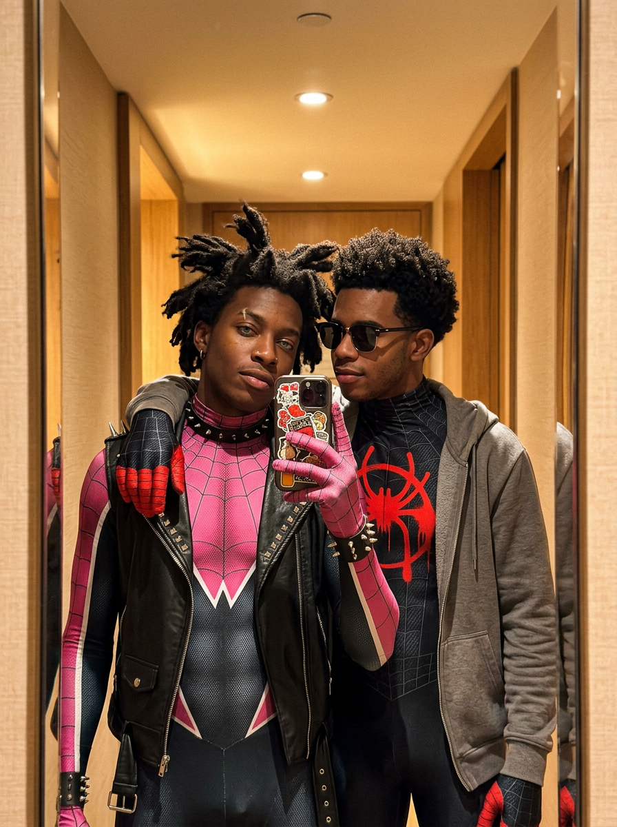 {"image_request":{"goal":"Create an ultra-authentic hyperrealistic mirror selfie \/ Miles Morales and Hobie Brown couple\/cosplay off-duty vibe \/ Spider-Verse romance \/ candid snapshot","meta":{"image_type":"Hyperrealistic Portrait \/ Cosplay Lifestyle \/ Mirror Selfie \/ Cinematic Character Portrait","quality":"8K, Ultra-HD, Masterpiece, Best Quality, Ultra-Detailed, Hyperrealistic","color_mode":"Full Color (warm indoor lighting)","style_mode":"raw_photoreal \/ candid superhero \/ social media aesthetic","aspect_ratio":"2:3","resolution":"1080x1620px"},"creative_style":"Candid social media mirror selfie aesthetic featuring Miles Morales and Hobie Brown in a relaxed, off-duty moment, wearing their Spider-suits with casual touches, warm ambient lighting, and an atmosphere.","overall_theme":"superhero romance \/ off-duty Spider-People \/ casual intimacy \/ warm cozy vibe","mood_vibe":"relaxed \/ romantic \/ cool \/ \/ authentic \/ youthful","style_keywords":["mirror selfie","Miles Morales","Hobie Brown","Spider-Verse","cosplay aesthetic","spandex texture","warm lighting","iPhone stickers","candid","couple goals"],"subject":{"count":"2","type":"couple (superheroes)","identity":"Young superhero couple. Male: Miles Morales (Black, Afro-, short curly faded hair\/afro). model: Hobie Brown (punk-rocker, messy mohawk dreads, green eyes).","identity_preservation":{"description":"Preserve the iconic character traits: Miles', Hobie's hair and piercing eyes. Maintain the exact pose from the reference.","notes":"Miles is wearing his mask pulled up or off (face ). Hobie has his jacket open."},"age_appearance":"Late \/ early 20s","skin":"Miles: Rich warm, realistic texture. Hobie: Fair, smooth with light stubble.","makeup":{"lips":"Hobie: natural. Miles: natural.","eyes":"natural.","general":"Fresh, post-hero-duty glow."},"facial_features":{"expression":"Hobie: confident gaze directed at phone screen. Miles: cool, relaxed, slightly protective expression behind sunglasses (optional) or just looking cool.","eyes":{"gaze":"Both looking at the mirror reflection.","intensity":" and relaxed."},"lips":{"gesture":"Relaxed."}},"hair":{"length":"Hobie: short to medium messy mohawk dreads. Miles: short textured afro.","texture":"Realistic hair strands.","style":"Casual, slightly messy.","lighting_interaction":{"light":"Warm overhead light catching the hair and defining Miles' curls.","shadow_play":"Soft facial shadows."}},"clothing":{"top":"Miles: Classic black and Red Spider-model suit (Miles design) with a casual grey hoodie worn unzipped over it (homage to Into the Spider-Verse). Hobie: Iconic Spider-Punk suit (Black, Pink studs and spikes, leather jacket details) with jacket open.","bottom":"Miles: suit legs . Hobie: suit legs.","full_description":"Miles wears his signature black and red suit with spray-paint logo, layered with a casual grey hoodie. Hobie wears his black, pink fitted spandex suit with studs. High-quality textured spandex\/fabric materials.","accessories":"Miles: Wearing cool sunglasses (like the reference). Hobie: Holding iPhone with sticker-bomb case."},"props":{"bouquet":"N\/A","wine_glass":"N\/A","other":"iPhone Pro in hand."}},"pose_action":{"description":"Standing mirror selfie in a hallway.","overall_pose":"Hobie standing in front holding the phone. Miles standing immediately behind him, leaning in slightly.","head_turn":"Both facing the mirror.","gaze":"Directed at the mirror\/phone.","body_position":"Standing close together, proximity.","hands":"Hobie holding phone. Miles' arm draped affectionately around his neck\/shoulder.","movement":"Static selfie pose."},"environment":{"setting":"Luxury hotel room hallway or modern apartment","location":"Indoors","weather":"N\/A","time_of_day":"Evening\/Artificial light","atmosphere":"Warm, private, safe haven"},"background":{"color":"Warm wood tones, beige","effect":"Reflection shows a narrow hallway with wooden paneling, creating a cozy backdrop for the colorful suits."},"lighting":{"type":"Artificial overhead recessed lighting","position":"Ceiling","direction":"Top-down","intensity":"Moderate \/ Warm","focus":"Evenly lighting the couple","falloff":"Soft","light_quality":"Warm tungsten","source":"Recessed ceiling lights","tone":"Golden \/ Warm beige","mood":"Cozy and romantic","subject_lighting":"Soft overhead fill reflecting on the suit textures","environment_lighting":"Warm ambient glow","color_temperature":"3200K","contrast_shadow":"Medium contrast","shadow_quality":"Soft","imperfections":["Smartphone camera noise","Subtle fabric sheen reflections"]},"camera":{"sensor_format":"Smartphone Sensor","lens":"26mm equivalent","position_angle":"Eye-level mirror reflection","distance":"Arm's length","framing":"Waist-up vertical shot","depth_of_field":"Deep","composition":{"framing":"Couple centered in mirror frame","depth":"Reflection creates depth","emphasis":"Suit details and chemistry","angle":"Straight-on mirror angle"}},"color_grading":{"palette":"Black, Pink, Red (Suits) contrasting with Warm Beige\/Wood background","lut":"Warm Interior \/ Cinematic Hero \/ Soft Gold","mood":"Warm \/ Romantic \/ Iconic"},"post_processing":{"sharpening":"High fidelity on suit textures (webbing patterns)","final_touch":"Warm color balance"},"negative":{"style":"drawing, painting, illustration, 3d render, cold lighting, cartoon, anime","content":"mask on (for faces to be ), distorted faces, bad anatomy, extra fingers, plain clothes","artifacts":"warped mirror, pixelation"},"additional_controls":{"focus_emphasis":"The characters' faces and the details of their suits.","grounding":"N\/A","special_notes":"Ensure Miles is wearing the grey hoodie OVER the suit to match the reference photo's silhouette while keeping his character iconic.","vibe":"Spider-Verse couple goals.","final_output_goal":"A photorealistic mirror selfie of Miles Morales and Hobie Brown in their suits, looking like a real photo taken by them."}}}