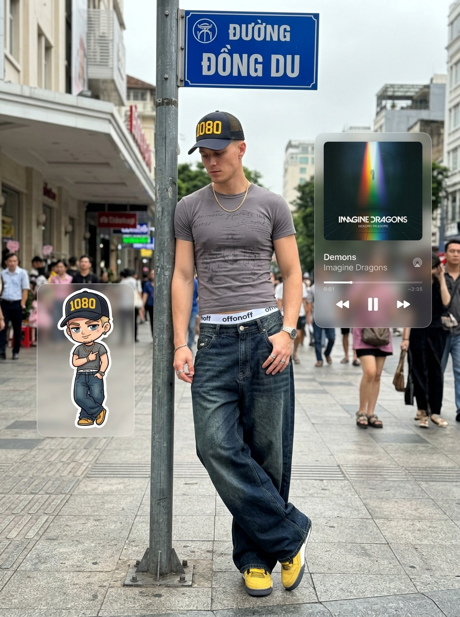 {"image_request":{"goal":"Urban Gen Z street fashion portrait of a blonde male model with personalized AR overlays","meta":{"image_type":"Hyperrealistic Portrait \/ Mixed Media \/ Urban Street Style \/ Social Media Aesthetic","quality":"8K, Ultra-HD, Masterpiece, Best Quality, Ultra-Detailed, Photorealistic with Graphic Elements","color_mode":"Full Color (Natural Daylight) \/ Vibrant Accents \/ Digital UI Overlay","style_mode":"raw_photoreal \/ urban_streetwear \/ mixed_media_collage","aspect_ratio":"3:4","resolution":"1080x1920"},"creative_style":"Contemporary street fashion photography blended with surreal mixed-media collage elements, social media story aesthetic, Y2K revival vibe, effortless cool, urban texture","overall_theme":"Y2K fashionable party night \/ urban chill \/ viral social media post \/ augmented reality fashion","mood_vibe":"cool confident relaxed\/urban trendy\/playful digital nostalgia","style_keywords":["streetwear","baggy jeans","Y2K fashion","augmented reality","music player widget","anime avatar","urban backdrop","candid","influencer aesthetic"],"subject":{"count":"1","type":"model","identity":"young male model, Gen Z aesthetic, short, styled hair","identity_preservation":{"description":"Preserve cool, detached expression and specific outfit details","notes":"Focus on the juxtaposition of realistic photography and digital stickers."},"age_appearance":"early 20s","skin":"natural texture, soft daylight illumination","makeup":{"lips":"natural","eyes":"obscured by cap shadow","general":"no makeup, fresh groomed look."},"facial_features":{"expression":"relaxed, looking down\/away, cool indifference","eyes":{"gaze":"downward or obscured","intensity":"low\/relaxed"},"lips":{"gesture":"neutral\/relaxed"}},"hair":{"length":"short","texture":"styled, textured","style":"short blonde styled hair under cap","lighting_interaction":{"light":"soft natural highlights on hair","shadow_play":"brim of hat casting shadow over eyes"}},"clothing":{"top":"fitted t-shirt with subtle graphic text","bottom":"extremely baggy dark wash denim jeans, low-rise","full_description":"fitted t-shirt, oversized baggy dark denim jeans, white 'OFFONOFF' branded underwear waistband, belt with grommets, trucker hat with yellow '1080' text, yellow sneakers","accessories":"gold chain necklace, wristwatch, silver rings"},"props":{"bouquet":"N\/A","wine_glass":"N\/A","other":"Silver street pole (leaning on), floating translucent music player widget (Song: 'Demons' - Artist: Imagine Dragons), mini 2D cartoon chibi version of subject mimicking his exact pose standing next to him."}},"pose_action":{"description":"Subject leaning casually back against a street pole on a sidewalk","overall_pose":"standing leaning back against pole, legs crossed at ankles","head_turn":"facing forward but tilted down","gaze":"downward","body_position":"relaxed slump against vertical pole","hands":"relaxed at sides \/ near pockets","movement":"static pose"},"environment":{"setting":"Urban street corner\/city sidewalk","location":"outdoor sidewalk next to cafe","weather":"overcast daylight","time_of_day":"daytime\/afternoon","atmosphere":"casual urban hustle, grey pavement, city vibes","background":{"color":"urban greys \/ building facade","effect":"natural depth of field, background slightly out of focus"}},"lighting":{"type":"natural overcast daylight","position":"overhead diffused","direction":"soft top-down","intensity":"moderate\/soft","focus":"even illumination on subject","falloff":"gentle","light_quality":"diffused, soft shadows","source":"sky","tone":"neutral \/ slightly cool daylight","mood":"casual\/everyday","subject_lighting":"even natural light","environment_lighting":"ambient daylight","color_temperature":"5500K daylight","contrast_shadow":"soft ambient occlusion","shadow_quality":"soft diffused","imperfections":[]},"camera":{"sensor_format":"Smartphone \/ Digital mirrorless","lens":"28mm or 35mm wide-angle","position_angle":"eye-level or slightly low angle","distance":"full body shot","framing":"vertical portrait framing including feet and headroom for widgets","depth_of_field":"moderate depth (f\/4 or f\/5.6)","composition":{"framing":"Full body shot","depth":"subject separated from background building","emphasis":"outfit details and digital overlays","angle":"front-facing"}},"color_grading":{"palette":"Urban neutrals (grey, white, denim blue) with a pop of yellow (shoes, hat text) and hair","lut":"Social media influencer preset \/ Clean Urban \/ Low Contrast","mood":"cool, desaturated with specific color pops"},"post_processing":{"sharpening":"standard digital sharpening","final_touch":"overlay of translucent iOS music player widget showing 'Demons' by Imagine Dragons and a small cartoon sticker of the blonde male model mimicking the exact pose"},"negative":{"style":"painting, drawing, sketch (for main subject), blurry, low res, overexposed","content":"deformed hands, missing limbs, extra legs, bad anatomy, wrong song title","artifacts":"glitch, noise"},"additional_controls":{"focus_emphasis":"Street style outfit and surreal floating UI elements","grounding":"Subject firmly leaning on pole, feet grounded on tactile paving","special_notes":"Include blue street sign '\u0110\u01af\u1edcNG \u0110\u00d4NG DU' on the pole above. Include floating music player UI on right (Imagine Dragons - Demons) and chibi blonde male character on left mimicking exact pose.","vibe":"Gen Z fit check","final_output_goal":"A photorealistic street fashion shot of a blonde male model with stylized augmented reality graphic overlays."}}}