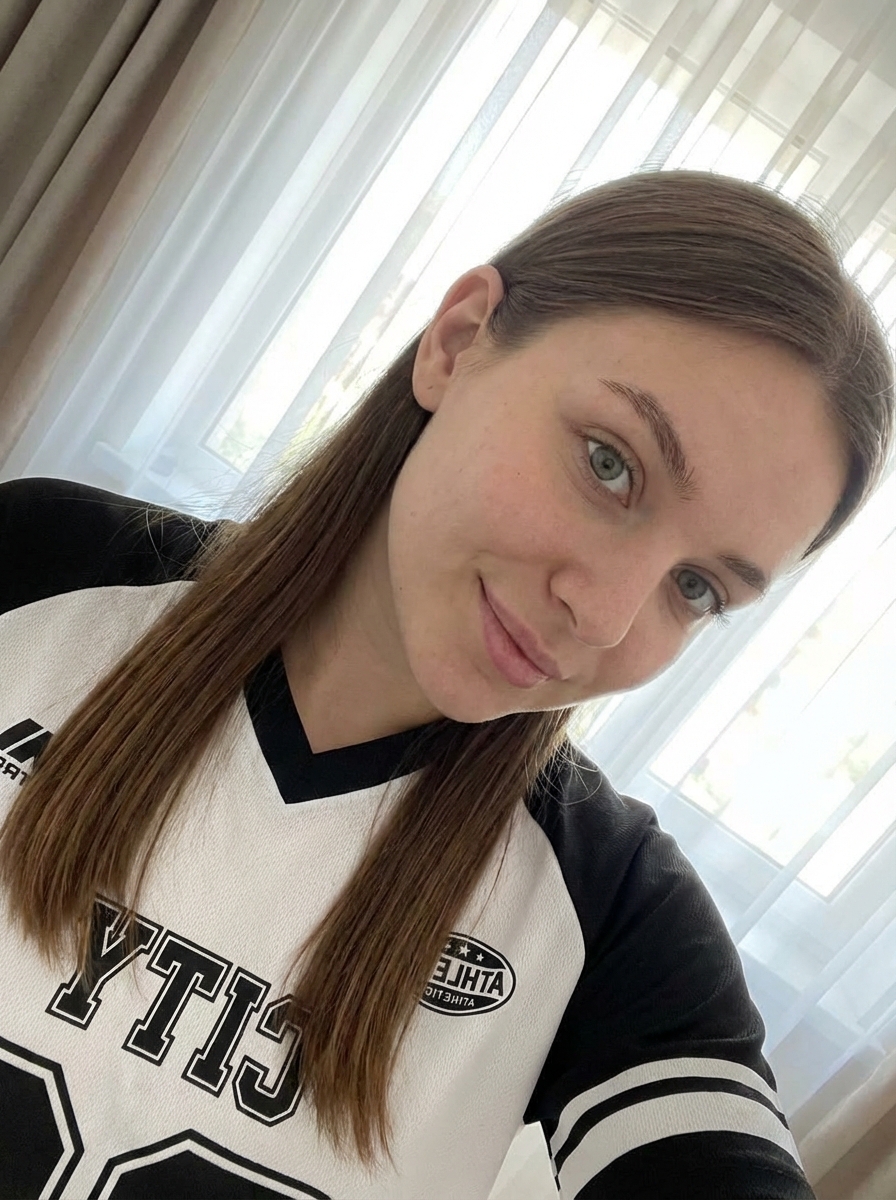 {"image_type": "photograph", "genre": "casual portrait", "composition": {"framing": "close-up, chest-up portrait", "angle": "slightly tilted, camera held above eye level and angled downward", "orientation": "portrait with diagonal tilt", "subject_placement": "subject positioned slightly off-center, face occupying left-middle area", "crop": "tight crop with partial arm visible in foreground"}, "subject": {"count": 1, "gender_presentation": "model-presenting", "age_range": "young adult", "facial_features": {"skin_tone": "light, neutral-warm", "complexion": "clear, smooth with natural texture", "eyes": "light green/gray, almond-shaped", "eyebrows": "medium thickness, natural shape", "nose": "straight, small to medium", "lips": "natural pink, closed-mouth slight smile"}, "hair": {hair, "length": "long", "style": "straight, tucked behind ear on one side", "part": "slight side part"}, "expression": "soft, relaxed, friendly", "gaze": "looking directly into camera", "accessories": ["small silver if(gender=f){stud earrings } "], "clothing": {"type": "sports jersey", "fit": "loose athletic fit", "color": "with accents", "details": ["collar trim", "logos and text", "shield-style emblem on chest", "large curved graphic text"]}}, "lighting": {"type": "natural light", "direction": "side/front light from window", "quality": "soft, diffused", "shadows": "minimal, gentle", "highlights": "subtle skin highlights on cheek and forehead"}, "color_palette": {"dominant_colors": ["white", "soft gray", "black"], "accent_colors": ["natural skin tones", "brown hair"], "overall_tone": "neutral, clean, airy"}, "background": {"setting": "indoor", "elements": ["sheer curtains", "window frame partially visible"], "depth_of_field": "moderate, background slightly soft but recognizable", "style": "minimalist, uncluttered"}, "technical_details": {"camera_type": "DSLR", "focal_length_equivalent": "wide-angle selfie lens", "resolution": "high", "sharpness": "sharp focus on face", "noise": "minimal", "white_balance": "neutral"}, "artistic_style": {"aesthetic": "clean, natural, lifestyle", "retouching": "very minimal, natural skin texture preserved", "mood": "calm, approachable, casual"}, "typography": {"presence": true, "location": "on jersey", "style": "bold sans-serif sports bra nding", hair, "readability": "partially visible due to crop"}}