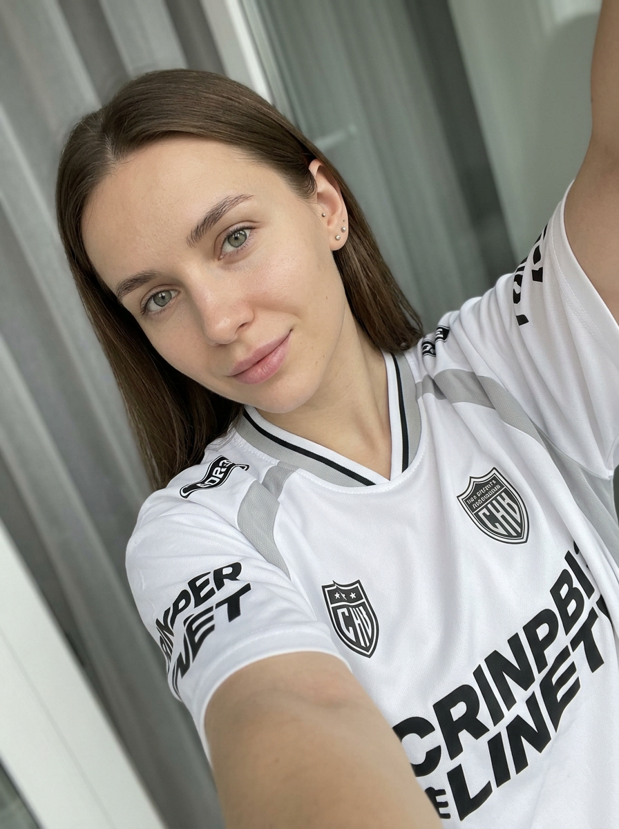 {"image_type": "photograph", "genre": "casual portrait", "composition": {"framing": "close-up, chest-up portrait", "angle": "slightly tilted, camera held above eye level and angled downward", "orientation": "portrait with diagonal tilt", "subject_placement": "subject positioned slightly off-center, face occupying left-middle area", "crop": "tight crop with partial arm in foreground"}, "subject": {"count": 1, "gender_presentation": "model-presenting", "age_range": "young adult", "facial_features": {"skin_tone": "light, neutral-warm", "complexion": "clear, smooth with natural texture", "eyes": "light green/gray, almond-shaped", "eyebrows": "medium thickness, natural shape", "nose": "straight, small to medium", "lips": "natural pink, closed-mouth slight smile"}, "hair": {hair, "length": "long", "style": "straight, tucked behind ear on one side", "part": "slight side part"}, "expression": "soft, relaxed, friendly", "gaze": "looking directly into camera", "accessories": ["small silver if(gender=f){stud earrings } "], "clothing": {"type": "sports jersey", "fit": "loose athletic fit", "color": "with accents", "details": ["collar trim", "logos and text", "shield-style emblem on chest", "large curved graphic text"]}}, "lighting": {"type": "natural light", "direction": "side/front light from window", "quality": "soft, diffused", "shadows": "minimal, gentle", "highlights": "subtle skin highlights on cheek and forehead"}, "color_palette": {"dominant_colors": ["white", "soft gray", "black"], "accent_colors": ["natural skin tones", "brown hair"], "overall_tone": "neutral, clean, airy"}, "background": {"setting": "indoor", "elements": ["sheer curtains", "window frame partially "], "depth_of_field": "moderate, background slightly soft but recognizable", "style": "minimalist, uncluttered"}, "technical_details": {"camera_type": "DSLR", "focal_length_equivalent": "wide-angle selfie lens", "resolution": "high", "sharpness": "sharp focus on face", "noise": "minimal", "white_balance": "neutral"}, "artistic_style": {"aesthetic": "clean, natural, lifestyle", "retouching": "very minimal, natural skin texture preserved", "mood": "calm, approachable, casual"}, "typography": {"presence": true, "location": "on jersey", "style": "bold sans-serif sports bra nding", hair, "readability": "partially due to crop"}}