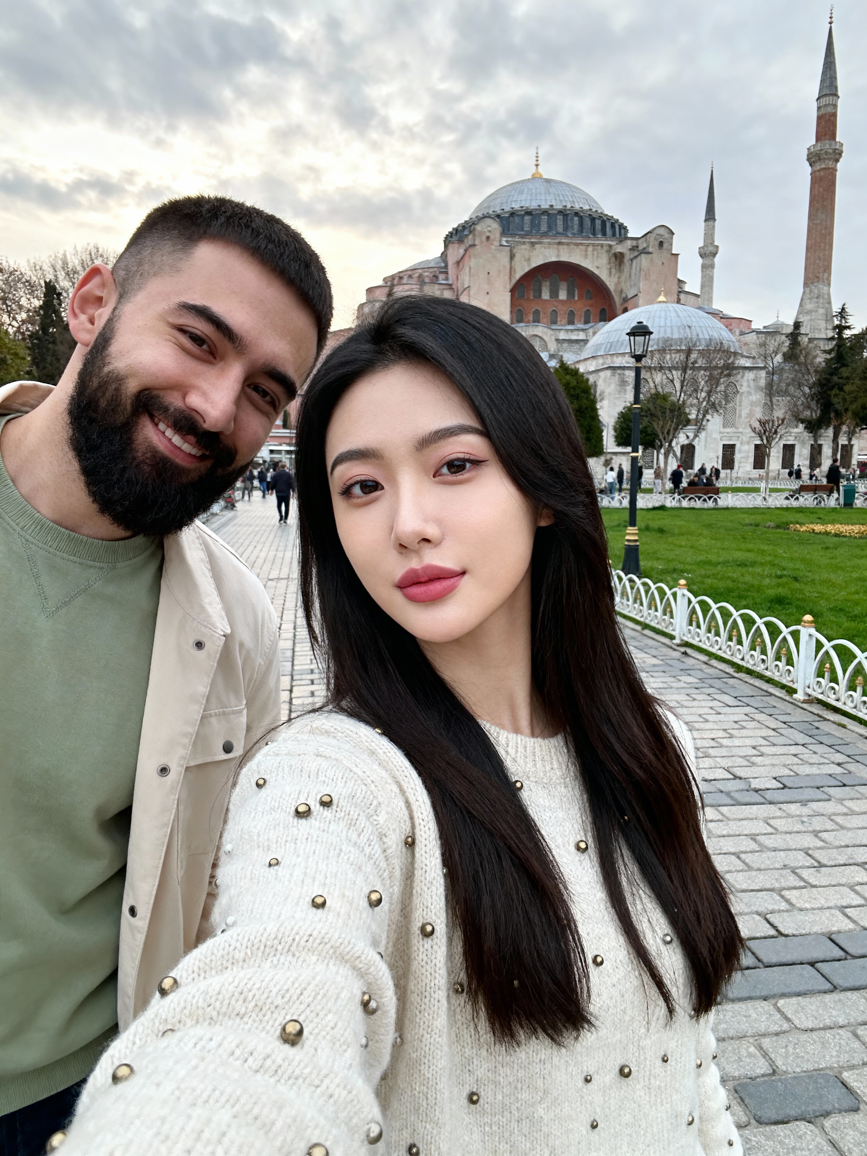 {"image_type": "photograph", "genre": "lifestyle portrait", "composition": {"framing": "tight foreground portrait with subjects occupying left and center frame, background architecture visible on right", "camera_angle": "slightly elevated arm-length selfie angle", "perspective": "wide-angle smartphone lens perspective", "subject_positioning": "male subject on left slightly behind, model subject centered in front", "cropping": "mid-chest crop with extended arm visible", "depth": "moderate depth of field; subjects sharp, background softly detailed"}, "subjects": [{"gender_presentation": "male", "approximate_age": "mid-20s to early-30s", "pose": "leaning head toward partner, relaxed smile", "facial_expression": "warm, subtle smile", "hair": {hair, "style": "short, neatly trimmed"}, "facial_hair": {"type": "full beard", "density": "medium", "grooming": "clean and shaped"}, "clothing": {"outerwear": "light beige jacket", "innerwear": "sage green crewneck shirt", "style": "casual minimalist"}}, {"gender_presentation": "model", "approximate_age": "early-20s to late-20s", "pose": "slightly angled face toward camera, chin slightly raised", "facial_expression": "soft confident pout / neutral expression", "hair": {hair, "length": "long", "style": "loose, straight with slight natural wave"}, if(gender=f){"makeup": {"base": "smooth matte foundation} ", "eyes": "defined brows, subtle eyeliner , neutral eyeshadow ", "lips": "matte rose-nude lipstick ", "overall_style": "polished natural glam"}, "clothing": {"top": "knit sweater", "details": "small metallic bead embellishments", "style": "soft, elegant casual"}}], "environment": {"location_type": "urban outdoor historic site", "background_elements": ["large domed mosque", "tall minaret", "manicured green lawn", "stone walkway", "tourists in background"], "architecture_style": "Ottoman / Islamic classical architecture", "crowd_density": "light to moderate pedestrian presence"}, "lighting": {"type": "natural daylight", "quality": "soft and diffused", "direction": "overhead and slightly frontal", "shadows": "minimal, soft-edged", "time_of_day": "late afternoon"}, "color_palette": {"dominant_colors": ["soft gray", "beige", "white", "muted green"], "skin_tones": "warm neutral", "overall_tone": "calm, airy, neutral"}, "weather": {"sky": "overcast with textured clouds", "atmosphere": "cool and mild"}, "technical_details": {"camera_type": "smartphone", "lens": "wide-angle front-facing camera", "focus": "face detection autofocus", "sharpness": "high on subjects", "noise": "minimal", "exposure": "well-balanced with preserved highlights"}, "artistic_style": {"aesthetic": "clean, modern lifestyle", "mood": "romantic, relaxed, travel-inspired", "visual_story": "couple capturing a candid moment at a cultural landmark"}, "post_processing": {"color_grading": "natural with slight warmth", "contrast": "moderate", "retouching": " smoothing, subtle enhancement", "filters": "minimal or none"}, "background_depth_and_separation": {"subject_separation": "achieved through proximity and framing rather than strong blur", "background_clarity": "recognizable but not distracting"}, "overall_style_tags": ["travel selfie", "couple portrait", "soft natural light", "urban tourism", "romantic casual"]}