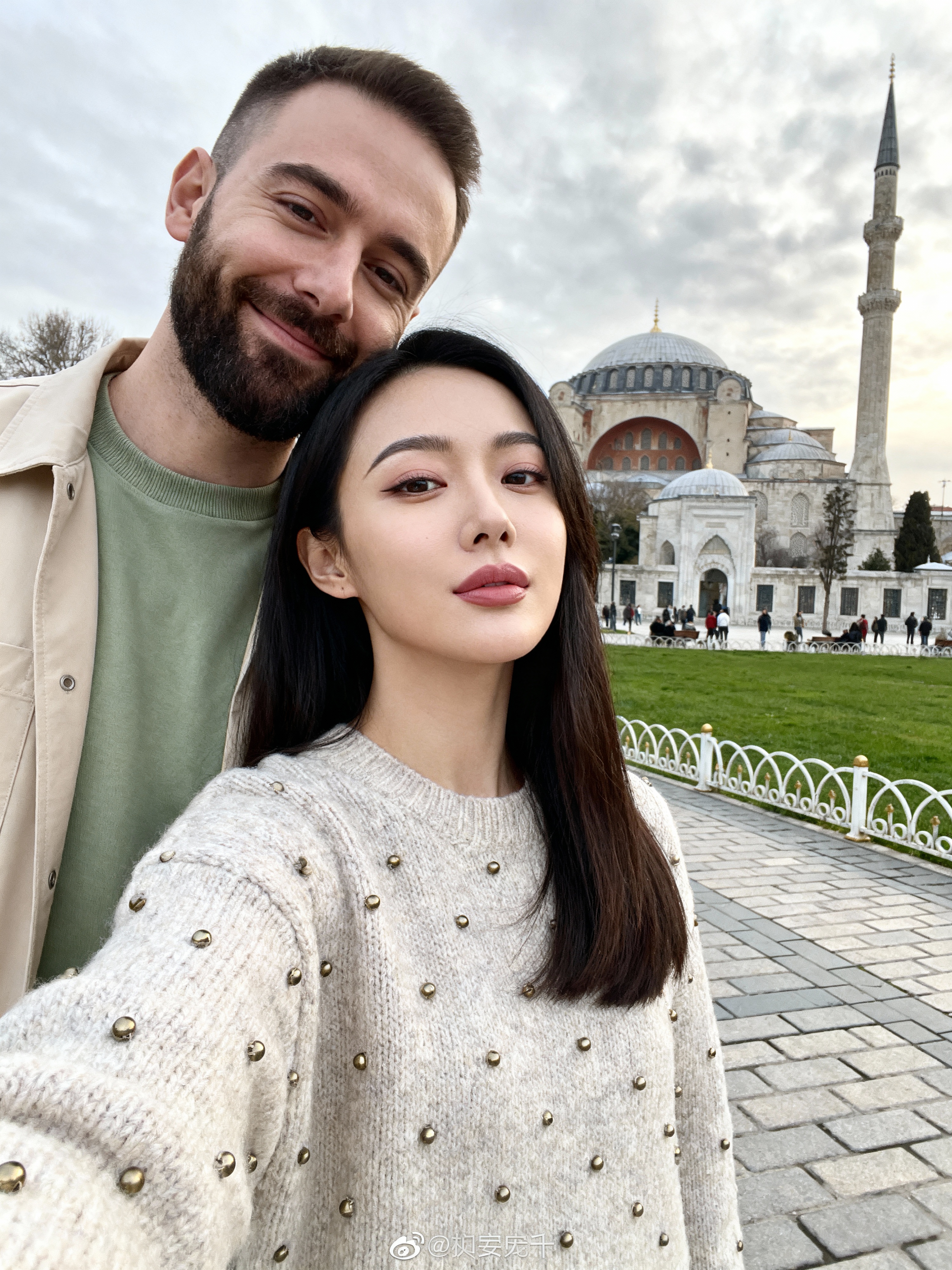 {"image_type": "photograph", "genre": "lifestyle portrait", "composition": {"framing": "tight foreground portrait with subjects occupying left and center frame, background architecture visible on right", "camera_angle": "slightly elevated arm-length selfie angle", "perspective": "wide-angle smartphone lens perspective", "subject_positioning": "male subject on left slightly behind, model subject centered in front", "cropping": "mid-chest crop with extended arm visible", "depth": "moderate depth of field; subjects sharp, background softly detailed"}, "subjects": [{"gender_presentation": "male", "approximate_age": "mid-20s to early-30s", "pose": "leaning head toward partner, relaxed smile", "facial_expression": "warm, subtle smile", "hair": {hair, "style": "short, neatly trimmed"}, "facial_hair": {"type": "full beard", "density": "medium", "grooming": "clean and shaped"}, "clothing": {"outerwear": "light beige jacket", "innerwear": "sage green crewneck shirt", "style": "casual minimalist"}}, {"gender_presentation": "model", "approximate_age": "early-20s to late-20s", "pose": "slightly angled face toward camera, chin slightly raised", "facial_expression": "soft confident pout / neutral expression", "hair": {hair, "length": "long", "style": "loose, straight with slight natural wave"}, if(gender=f){"makeup": {"base": "smooth matte foundation} ", "eyes": "defined brows, subtle eyeliner , neutral eyeshadow ", "lips": "matte rose-nude lipstick ", "overall_style": "polished natural glam"}, "clothing": {"top": "knit sweater", "details": "small metallic bead embellishments", "style": "soft, elegant casual"}}], "environment": {"location_type": "urban outdoor historic site", "background_elements": ["large domed mosque", "tall minaret", "manicured green lawn", "stone walkway", "tourists in background"], "architecture_style": "Ottoman / Islamic classical architecture", "crowd_density": "light to moderate pedestrian presence"}, "lighting": {"type": "natural daylight", "quality": "soft and diffused", "direction": "overhead and slightly frontal", "shadows": "minimal, soft-edged", "time_of_day": "late afternoon"}, "color_palette": {"dominant_colors": ["soft gray", "beige", "white", "muted green"], "skin_tones": "warm neutral", "overall_tone": "calm, airy, neutral"}, "weather": {"sky": "overcast with textured clouds", "atmosphere": "cool and mild"}, "technical_details": {"camera_type": "smartphone", "lens": "wide-angle front-facing camera", "focus": "face detection autofocus", "sharpness": "high on subjects", "noise": "minimal", "exposure": "well-balanced with preserved highlights"}, "artistic_style": {"aesthetic": "clean, modern lifestyle", "mood": "romantic, relaxed, travel-inspired", "visual_story": "couple capturing a candid moment at a cultural landmark"}, "post_processing": {"color_grading": "natural with slight warmth", "contrast": "moderate", "retouching": " smoothing, subtle enhancement", "filters": "minimal or none"}, "background_depth_and_separation": {"subject_separation": "achieved through proximity and framing rather than strong blur", "background_clarity": "recognizable but not distracting"}, "overall_style_tags": ["travel selfie", "couple portrait", "soft natural light", "urban tourism", "romantic casual"]}