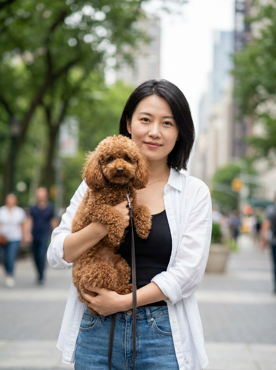 {"image_type": "photograph", "orientation": "portrait", "composition": {"framing": "medium shot", "camera_angle": "eye-level", "subject_placement": "centered with slight left bias", "depth_of_field": "shallow", "background_blur": "strong bokeh", "balance": "asymmetrical but visually balanced", "crop": "above knees"}, "subjects": [{"type": "human", "gender_presentation": "model", "age_range": "young adult", "pose": "standing, holding dog close to torso", "expression": "soft smile, relaxed", "gaze": "toward camera", "hair": {hair, "style": "short"}, "clothing": {"top": "lightweight button-up shirt", "inner_layer": "sleeveless top", "bottom": "blue denim jeans", "style": "casual, urban"}}, {"type": "animal", "species": "dog", "breed_appearance": "small poodle-type", "fur": {hair, "texture": "curly, dense"}, "pose": "cradled in arms, legs relaxed", "accessories": "dark leash attached"}], "environment": {"setting": "outdoor urban park or pedestrian area", "background_elements": ["trees", "paved walkway", "distant buildings", "blurred pedestrians"], "season_impression": "spring or mild summer"}, "lighting": {"type": "natural daylight", "quality": "soft and diffused", "direction": "frontal with slight overhead", "shadows": "minimal and soft", "highlights": "gentle skin highlights"}, "color_palette": {"dominant_colors": ["white", "soft green", "warm brown", "muted blue"], "tone": "warm-neutral", "saturation": "moderate", "contrast": "low to moderate"}, "technical_details": {"camera_type": "DSLR or mirrorless", "lens_characteristics": "wide aperture portrait lens", "approx_aperture": "f/1.8–f/2.8", "focal_length_estimate": "50mm–85mm equivalent", "sharpness": "high on subjects, soft background", "noise": "minimal"}, "artistic_style": {"genre": "lifestyle portrait photography", "mood": "warm, friendly, candid", "aesthetic": "clean, modern, natural", "post_processing": {"skin_tones": "natural and even", "color_grading": "light warm adjustment", "retouching": "minimal"}}, "background": {"clarity": "intentionally blurred", "function": "contextual without distraction", "lighting_consistency": "matches subject lighting"}, "overall_impression": "A natural lifestyle portrait capturing a relaxed urban moment, emphasizing warmth, companionship, and approachability through soft lighting and shallow depth of field."}