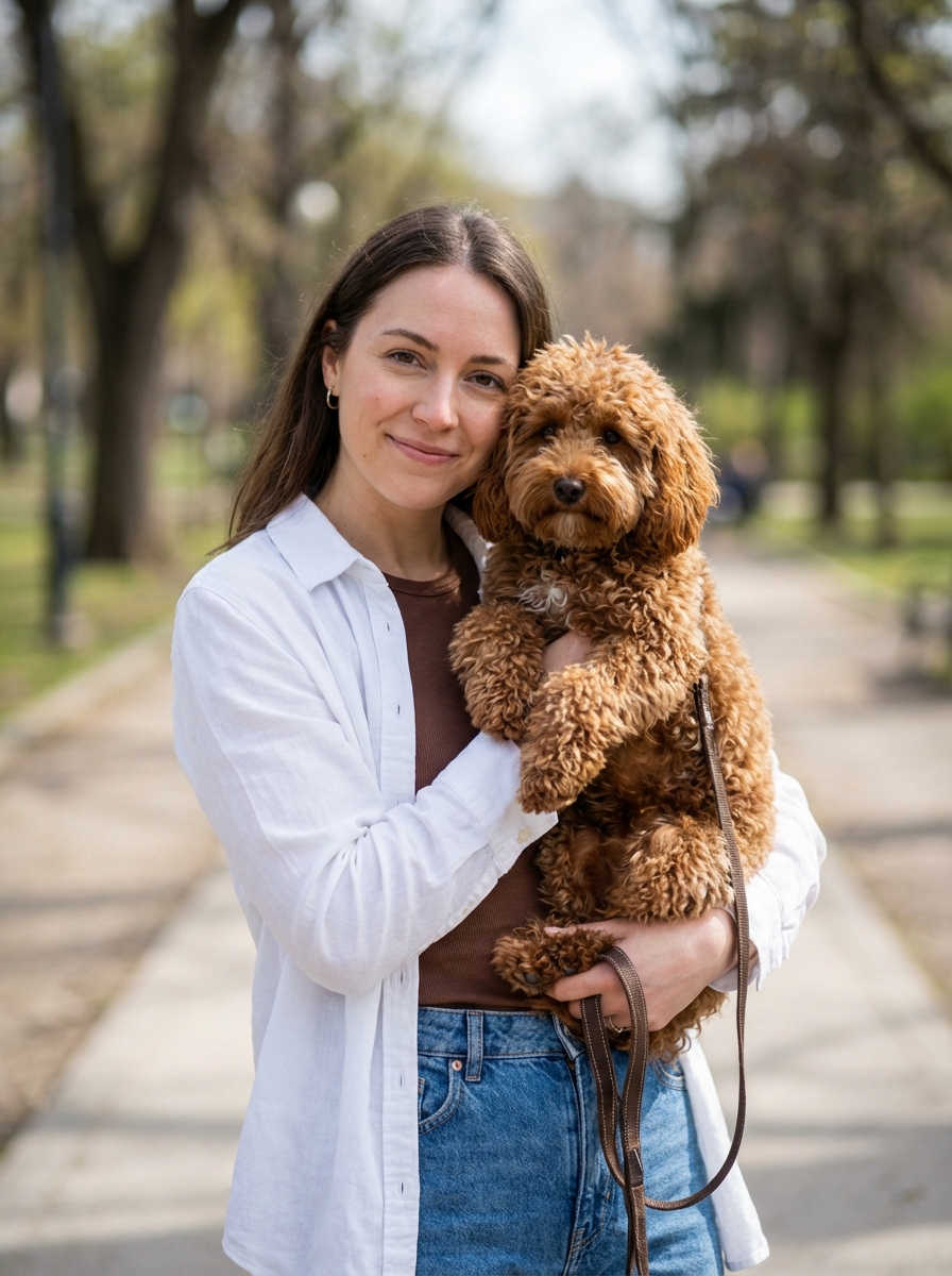 {"image_type": "photograph", "orientation": "portrait", "composition": {"framing": "medium shot", "camera_angle": "eye-level", "subject_placement": "centered with slight left bias", "depth_of_field": "shallow", "background_blur": "strong bokeh", "balance": "asymmetrical but visually balanced", "crop": "above knees"}, "subjects": [{"type": "human", "gender_presentation": "model", "age_range": "young adult", "pose": "standing, holding dog close to torso", "expression": "soft smile, relaxed", "gaze": "toward camera", "hair": {hair, "style": "short"}, "clothing": {"top": "lightweight button-up shirt", "inner_layer": "sleeveless top", "bottom": "blue denim jeans", "style": "casual, urban"}}, {"type": "animal", "species": "dog", "breed_appearance": "small poodle-type", "fur": {hair, "texture": "curly, dense"}, "pose": "cradled in arms, legs relaxed", "accessories": "dark leash attached"}], "environment": {"setting": "outdoor urban park or pedestrian area", "background_elements": ["trees", "paved walkway", "distant buildings", "blurred pedestrians"], "season_impression": "spring or mild summer"}, "lighting": {"type": "natural daylight", "quality": "soft and diffused", "direction": "frontal with slight overhead", "shadows": "minimal and soft", "highlights": "gentle skin highlights"}, "color_palette": {"dominant_colors": ["white", "soft green", "warm brown", "muted blue"], "tone": "warm-neutral", "saturation": "moderate", "contrast": "low to moderate"}, "technical_details": {"camera_type": "DSLR or mirrorless", "lens_characteristics": "wide aperture portrait lens", "approx_aperture": "f/1.8–f/2.8", "focal_length_estimate": "50mm–85mm equivalent", "sharpness": "high on subjects, soft background", "noise": "minimal"}, "artistic_style": {"genre": "lifestyle portrait photography", "mood": "warm, friendly, candid", "aesthetic": "clean, modern, natural", "post_processing": {"skin_tones": "natural and even", "color_grading": "light warm adjustment", "retouching": "minimal"}}, "background": {"clarity": "intentionally blurred", "function": "contextual without distraction", "lighting_consistency": "matches subject lighting"}, "overall_impression": "A natural lifestyle portrait capturing a relaxed urban moment, emphasizing warmth, companionship, and approachability through soft lighting and shallow depth of field."}