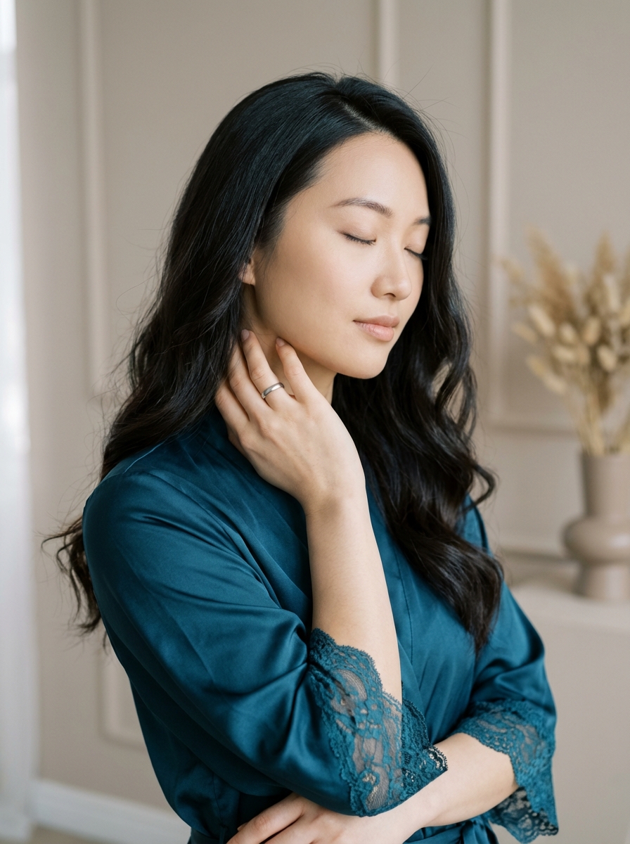 {"image_type": "photographic portrait", "resolution_target": "8K ultra-high-definition", "orientation": "vertical", "framing": {"shot_type": "medium close-up", "crop": "subject framed from upper torso to top of head", "camera_angle": "eye-level, slightly angled from subject's left side"}, "subject": {"person_count": 1, "gender_presentation": "model-presenting", "age_appearance": "young adult", "pose": {"head_position": "tilted slightly downward and to the right", "eyes": "closed", "hands": {"right_hand": "gently touching the left side of the neck", "left_hand": "resting downward, partially visible"}, "body_language": "relaxed, calm, introspective"}, "expression": {"facial_expression": "serene, peaceful", "mouth": "closed, relaxed lips"}, "skin": {"tone": "light to medium", "texture": "smooth, natural", "visible_features": "soft natural complexion, subtle highlights on cheek and nose"}, "hair": {hair, "length": "long", "style": "loose, softly wavy", "parting": "side-parted", "finish": "natural sheen"}}, "clothing_and_accessories": {"top": {"type": "robe", "material": "satin-like fabric", "color": "deep teal / blue-green", "details": {"sleeves": "three-quarter length", "trim": "lace detailing at sleeve cuffs", "lace_color": "slightly darker teal"}}, "jewelry": {"ring": {"hand": "right hand", "finger": "ring finger", "design": "simple, thin band", "color": "metallic silver tone"}}}, "lighting": {"type": "soft natural light", "direction": "coming from the left side of the frame", "quality": "diffused, gentle", "shadows": "soft, minimal contrast", "highlights": "subtle highlights on face and hair"}, "color_palette": {"dominant_colors": ["teal", "soft beige", "warm gray", "muted white"], "overall_tone": "muted, calm, elegant"}, "background": {"environment": "indoor", "style": "minimalist, classic", "wall": {hair, "details": "subtle decorative molding"}, "objects": {"vase": {"location": "right side background", "material": "ceramic or matte finish", hair, "contents": "dried beige plants"}}, "depth_of_field": "shallow", "background_focus": "softly blurred"}, "camera_and_lens_characteristics": {"focus": "sharp on subject's face and hand", "bokeh": "smooth, natural background blur", "noise": "minimal to none", "clarity": "high, clean image"}, "mood_and_aesthetic": {"emotion": "calm, intimate, reflective", "style": "fine-art portrait photography", "realism": "highly realistic", "ai_editing_preference": "clean, refined, ultra-detailed without overprocessing"}, "generation_notes": {"avoid": ["harsh lighting", "exaggerated facial features", "extra jewelry", "added objects not visible in the image", "artificial skin smoothing"], "detail_priority": "preserve natural textures, fabric detail, skin realism, and soft lighting gradients", "render_quality": "photorealistic, cinematic, professional studio-grade output"}}