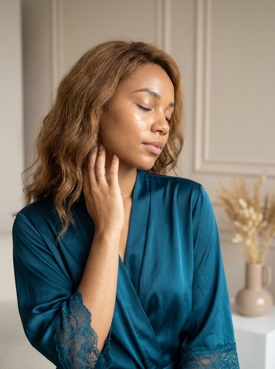 {"image_type": "photographic portrait", "resolution_target": "8K ultra-high-definition", "orientation": "vertical", "framing": {"shot_type": "medium close-up", "crop": "subject framed from upper torso to top of head", "camera_angle": "eye-level, slightly angled from subject's left side"}, "subject": {"person_count": 1, "gender_presentation": "model-presenting", "age_appearance": "young adult", "pose": {"head_position": "tilted slightly downward and to the right", "eyes": "closed", "hands": {"right_hand": "gently touching the left side of the neck", "left_hand": "resting downward, partially visible"}, "body_language": "relaxed, calm, introspective"}, "expression": {"facial_expression": "serene, peaceful", "mouth": "closed, relaxed lips"}, "skin": {"tone": "light to medium", "texture": "smooth, natural", "visible_features": "soft natural complexion, subtle highlights on cheek and nose"}, "hair": {hair, "length": "long", "style": "loose, softly wavy", "parting": "side-parted", "finish": "natural sheen"}}, "clothing_and_accessories": {"top": {"type": "robe", "material": "satin-like fabric", "color": "deep teal / blue-green", "details": {"sleeves": "three-quarter length", "trim": "lace detailing at sleeve cuffs", "lace_color": "slightly darker teal"}}, "jewelry": {"ring": {"hand": "right hand", "finger": "ring finger", "design": "simple, thin band", "color": "metallic silver tone"}}}, "lighting": {"type": "soft natural light", "direction": "coming from the left side of the frame", "quality": "diffused, gentle", "shadows": "soft, minimal contrast", "highlights": "subtle highlights on face and hair"}, "color_palette": {"dominant_colors": ["teal", "soft beige", "warm gray", "muted white"], "overall_tone": "muted, calm, elegant"}, "background": {"environment": "indoor", "style": "minimalist, classic", "wall": {hair, "details": "subtle decorative molding"}, "objects": {"vase": {"location": "right side background", "material": "ceramic or matte finish", hair, "contents": "dried beige plants"}}, "depth_of_field": "shallow", "background_focus": "softly blurred"}, "camera_and_lens_characteristics": {"focus": "sharp on subject's face and hand", "bokeh": "smooth, natural background blur", "noise": "minimal to none", "clarity": "high, clean image"}, "mood_and_aesthetic": {"emotion": "calm, intimate, reflective", "style": "fine-art portrait photography", "realism": "highly realistic", "ai_editing_preference": "clean, refined, ultra-detailed without overprocessing"}, "generation_notes": {"avoid": ["harsh lighting", "exaggerated facial features", "extra jewelry", "added objects not visible in the image", "artificial skin smoothing"], "detail_priority": "preserve natural textures, fabric detail, skin realism, and soft lighting gradients", "render_quality": "photorealistic, cinematic, professional studio-grade output"}}