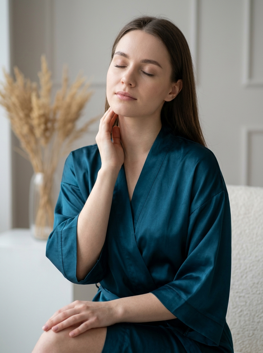 {"image_type": "photographic portrait", "resolution_target": "8K ultra-high-definition", "orientation": "vertical", "framing": {"shot_type": "medium close-up", "crop": "subject framed from upper to top of head", "camera_angle": "eye-level, slightly angled from subject's left side"}, "subject": {"person_count": 1, "gender_presentation": "model-presenting", "age_appearance": "young adult", "pose": {"head_position": "tilted slightly downward and to the right", "eyes": "closed", "hands": {"right_hand": "gently touching the left side of the neck", "left_hand": "resting downward, partially "}, "body_language": "relaxed, calm, introspective"}, "expression": {"facial_expression": "serene, peaceful", "mouth": "closed, relaxed lips"}, "skin": {"tone": "light to medium", "texture": "smooth, natural", "visible_features": "soft natural complexion, subtle highlights on cheek and nose"}, "hair": {hair, "length": "long", "style": "loose, softly wavy", "parting": "side-parted", "finish": "natural sheen"}}, "clothing_and_accessories": {"top": {"type": "robe", "material": "satin-like fabric", "color": "deep teal / blue-green", "details": {"sleeves": "three-quarter length", "trim": "lace detailing at sleeve cuffs", "lace_color": "slightly darker teal"}}, "jewelry": {"ring": {"hand": "right hand", "finger": "ring finger", "design": "simple, thin band", "color": "metallic silver tone"}}}, "lighting": {"type": "soft natural light", "direction": "coming from the left side of the frame", "quality": "diffused, gentle", "shadows": "soft, minimal contrast", "highlights": "subtle highlights on face and hair"}, "color_palette": {"dominant_colors": ["teal", "soft beige", "warm gray", "muted white"], "overall_tone": "muted, calm, elegant"}, "background": {"environment": "indoor", "style": "minimalist, classic", "wall": {hair, "details": "subtle decorative molding"}, "objects": {"vase": {"location": "right side background", "material": "ceramic or matte finish", hair, "contents": "dried beige plants"}}, "depth_of_field": "shallow", "background_focus": "softly blurred"}, "camera_and_lens_characteristics": {"focus": "sharp on subject's face and hand", "bokeh": "smooth, natural background blur", "noise": "minimal to none", "clarity": "high, clean image"}, "mood_and_aesthetic": {"emotion": "calm, , reflective", "style": "fine-art portrait photography", "realism": "highly realistic", "ai_editing_preference": "clean, refined, ultra-detailed overprocessing"}, "generation_notes": {"avoid": ["harsh lighting", "exaggerated facial features", "extra jewelry", "added objects not in the image", "artificial skin smoothing"], "detail_priority": "preserve natural textures, fabric detail, skin realism, and soft lighting gradients", "render_quality": "photorealistic, cinematic, professional studio-grade output"}}