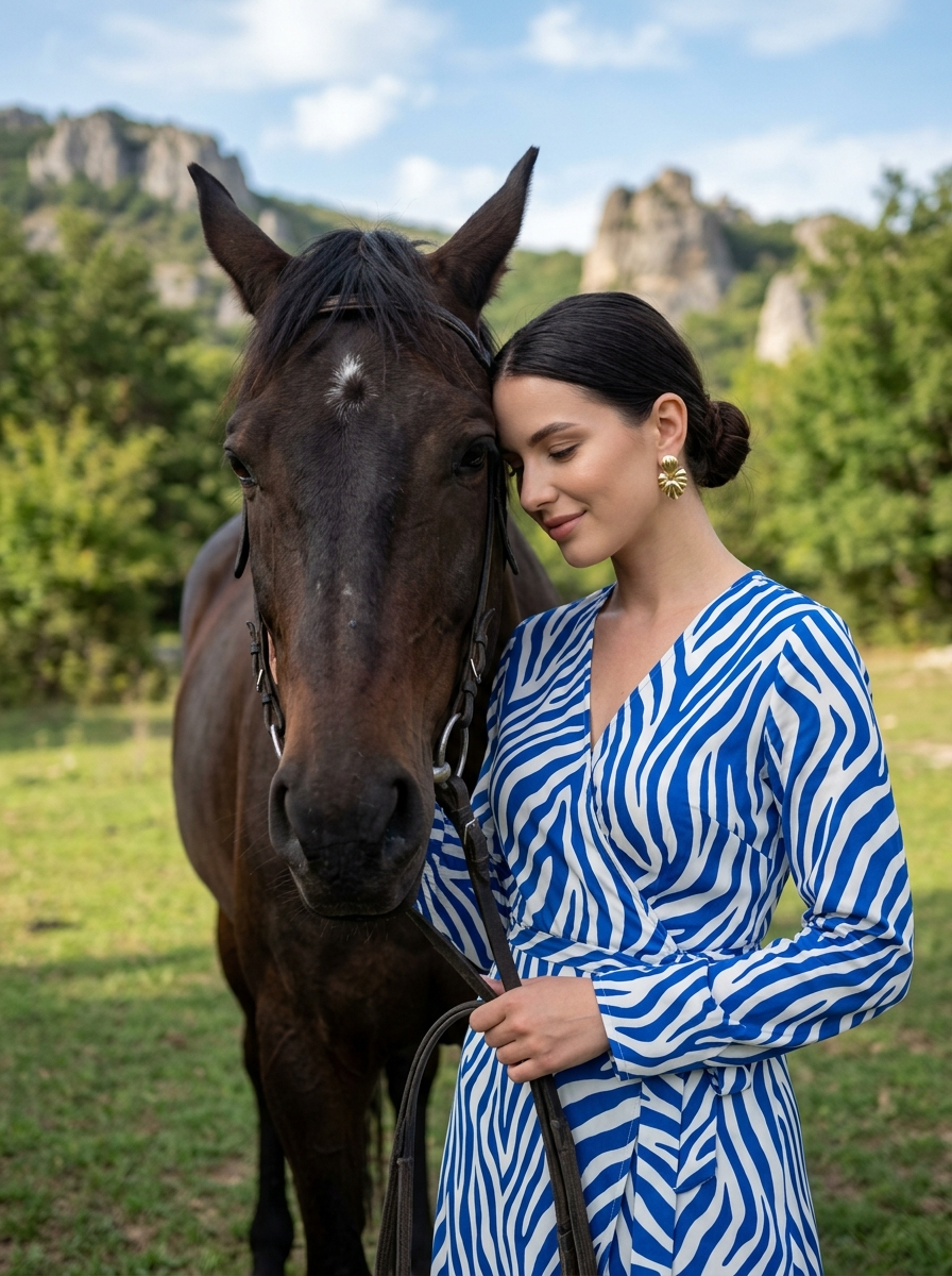 {"image_type":"photograph","genre":"lifestyle portrait with animal","composition":{"framing":"vertical portrait orientation","shot_type":"medium close-up selfie-style composition","camera_angle":"slightly elevated arm-length angle","subject_positioning":"human subject on right third, horse head occupying left third, faces close and parallel","depth_of_field":"moderate, subjects sharp with softly blurred background","balance":"asymmetrical balance between human face and horse head"},"subjects":[{"type":"human","description":"young model","pose":"standing beside horse, leaning head gently toward horse","expression":"soft smile, relaxed and confident","gaze":"directly toward camera","hair":{"color":"dark brown\/black","style":"pulled back into a low bun or ponytail ","texture":"smooth"},"makeup":{"style":"polished natural glam","details":"defined eyebrows, subtle eyeshadow , eyeliner , rosy blush , pink lipstick "},"accessories":["gold statement earrings "],"clothing":{"type":"long-sleeve wrap-style dress","pattern":"abstract zebra-like stripes","colors":["white","royal blue"],"fabric":"lightweight flowing fabric"}},{"type":"animal","species":"horse","coat_color":"dark brown","markings":"small star on forehead","tack":{"bridle":"dark leather bridle with metal fittings","reins":"reins held by human subject"},"pose":"standing calmly, head slightly lowered"}],"environment":{"setting":"outdoor natural landscape","location_type":"countryside or mountainous area","background_elements":["green grass","trees","rocky mountain formation","blue sky with scattered clouds"],"season":"spring or summer"},"lighting":{"type":"natural daylight","direction":"front-left sunlight","quality":"soft yet bright","shadows":"gentle shadows under chin and along horse\u2019s contours","overall_exposure":"well- with vibrant highlights"},"color_palette":{"dominant_colors":["blue","white","green","brown"],"tone":"fresh, vibrant, natural","contrast":"moderate","saturation":"medium-high"},"technical_details":{"camera_type":"smartphone or mirrorless camera","lens_equivalent":"wide to standard (approximately 24\u201335mm)","focus":"face-detection focus on human subject","image_clarity":"high resolution, sharp details","noise":"minimal"},"artistic_style":{"aesthetic":"luxury lifestyle meets nature","mood":"serene, elegant, ","influences":["fashion editorial","travel lifestyle photography"]},"post_processing":{"retouching":" smoothing and color correction","color_grading":"cool blues balanced with warm skin tones","sharpening":"moderate, focused on faces"},"background_blur":{"type":"natural depth-of-field blur","intensity":"subtle"},"overall_description":"An elegant outdoor lifestyle portrait capturing a stylish model and her horse in a sunlit natural setting, blending fashion-forward styling with pastoral serenity."}