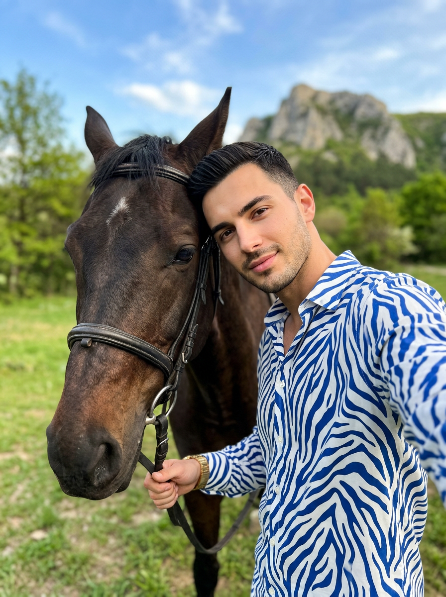 {"image_type":"photograph","genre":"lifestyle portrait with animal","composition":{"framing":"vertical portrait orientation","shot_type":"medium close-up selfie-style composition","camera_angle":"slightly elevated arm-length angle","subject_positioning":"human subject on right third, horse head occupying left third, faces close and parallel","depth_of_field":"moderate, subjects sharp with softly blurred background","balance":"asymmetrical balance between human face and horse head"},"subjects":[{"type":"human","description":"young male model with athletic build","pose":"standing beside horse, leaning head confidently toward horse","expression":"soft smile, relaxed and confident","gaze":"directly toward camera","hair":{"color":"dark brown\/black","style":"short neatly styled","texture":"smooth"},"makeup":{"style":"polished natural","details":"groomed eyebrows, clean skin, light stubble"},"accessories":["gold wristwatch"],"clothing":{"type":"long-sleeve button-down shirt","pattern":"abstract zebra-like stripes","colors":["white","royal blue"],"fabric":"lightweight flowing fabric"}},{"type":"animal","species":"horse","coat_color":"dark brown","markings":"small star on forehead","tack":{"bridle":"dark leather bridle with metal fittings","reins":"reins held by human subject"},"pose":"standing calmly, head slightly lowered"}],"environment":{"setting":"outdoor natural landscape","location_type":"countryside or mountainous area","background_elements":["green grass","trees","rocky mountain formation","blue sky with scattered clouds"],"season":"spring or summer"},"lighting":{"type":"natural daylight","direction":"front-left sunlight","quality":"soft yet bright","shadows":"gentle shadows under chin and along horse\u2019s contours","overall_exposure":"well- with vibrant highlights"},"color_palette":{"dominant_colors":["blue","white","green","brown"],"tone":"fresh, vibrant, natural","contrast":"moderate","saturation":"medium-high"},"technical_details":{"camera_type":"smartphone or mirrorless camera","lens_equivalent":"wide to standard (approximately 24\u201335mm)","focus":"face-detection focus on human subject","image_clarity":"high resolution, sharp details","noise":"minimal"},"artistic_style":{"aesthetic":"luxury lifestyle meets nature","mood":"serene, elegant, ","influences":["fashion editorial","travel lifestyle photography"]},"post_processing":{"retouching":" smoothing and color correction","color_grading":"cool blues balanced with warm skin tones","sharpening":"moderate, focused on faces"},"background_blur":{"type":"natural depth-of-field blur","intensity":"subtle"},"overall_description":"An elegant outdoor lifestyle portrait capturing a stylish young model and his horse in a sunlit natural setting, blending fashion-forward styling with pastoral serenity."}