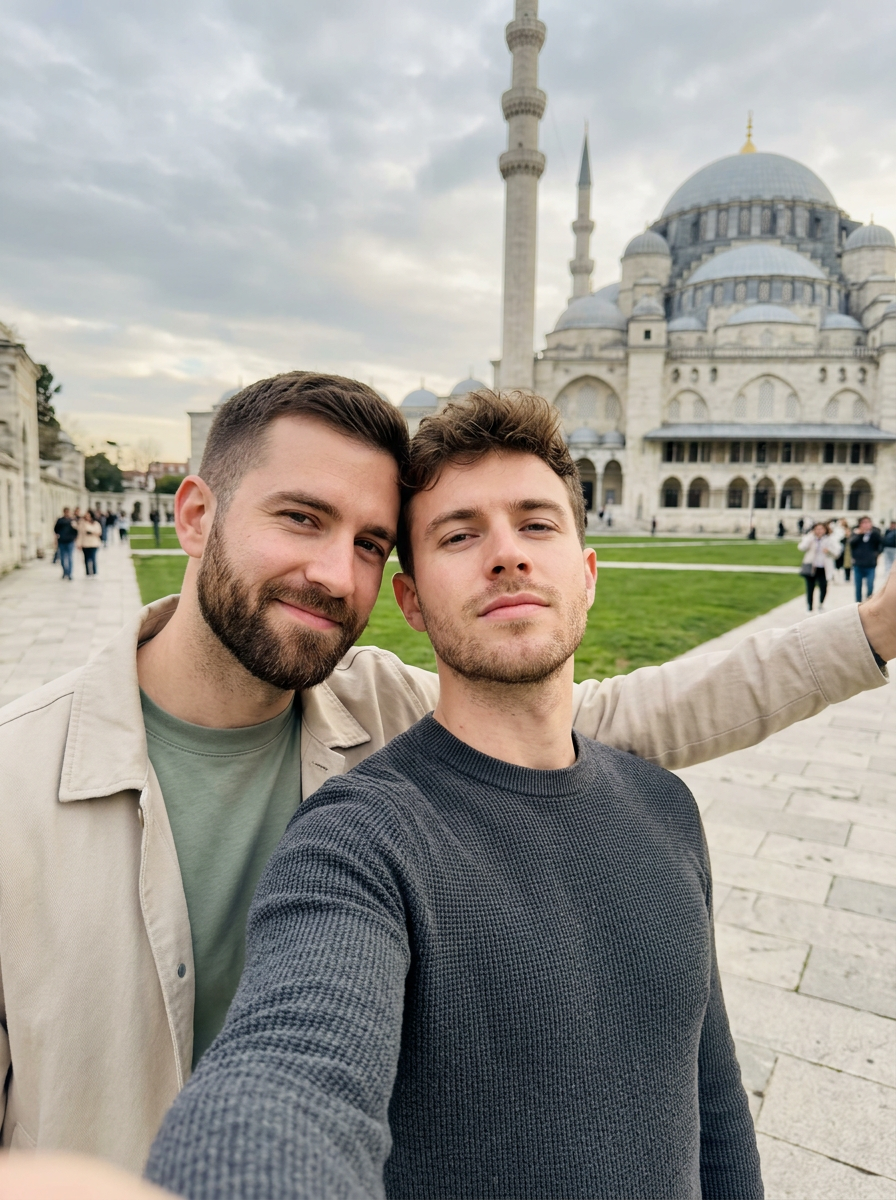 {"image_type":"photograph","genre":"lifestyle portrait","composition":{"framing":"tight foreground portrait with subjects occupying left and center frame, background architecture on right","camera_angle":"slightly elevated arm-length selfie angle","perspective":"wide-angle smartphone lens perspective","subject_positioning":"male subject on left slightly behind, model subject centered in front","cropping":"mid-chest crop with extended arm ","depth":"moderate depth of field; subjects sharp, background softly detailed"},"subjects":[{"gender_presentation":"male","approximate_age":"mid-20s to early-30s","pose":"leaning head toward partner, relaxed smile","facial_expression":"warm, subtle smile","hair":{"style":"short, neatly trimmed"},"facial_hair":{"type":"full beard","density":"medium","grooming":"clean and shaped"},"clothing":{"outerwear":"light beige jacket","innerwear":"sage green crewneck shirt","style":"casual minimalist"}},{"gender_presentation":"male","approximate_age":"early-20s to late-20s","pose":"slightly angled face toward camera, chin slightly raised","facial_expression":"confident neutral expression","hair":{"length":"short","style":"tousled with natural texture"},"facial_hair":{"type":"light stubble","density":"sparse","grooming":"clean and groomed"},"grooming":{"overall_style":"clean natural look","eyes":"natural features","lips":"natural features"},"clothing":{"top":"fitted knit sweater","details":"subtle texture","style":"relaxed casual"}}],"environment":{"location_type":"urban outdoor historic site","background_elements":["large domed mosque","tall minaret","manicured green lawn","stone walkway","tourists in background"],"architecture_style":"Ottoman \/ Islamic classical architecture","crowd_density":"light to moderate pedestrian presence"},"lighting":{"type":"natural daylight","quality":"soft and diffused","direction":"overhead and slightly frontal","shadows":"minimal, soft-edged","time_of_day":"late afternoon"},"color_palette":{"dominant_colors":["soft gray","beige","white","muted green"],"skin_tones":"warm neutral","overall_tone":"calm, airy, neutral"},"weather":{"sky":"overcast with textured clouds","atmosphere":"cool and mild"},"technical_details":{"camera_type":"smartphone","lens":"wide-angle front-facing camera","focus":"face detection autofocus","sharpness":"high on subjects","noise":"minimal","exposure":"well-balanced with preserved highlights"},"artistic_style":{"aesthetic":"clean, modern lifestyle","mood":"romantic, relaxed, travel-inspired","visual_story":"couple capturing a candid moment at a cultural landmark"},"post_processing":{"color_grading":"natural with slight warmth","contrast":"moderate","retouching":"smoothing, subtle enhancement","filters":"minimal or none"},"background_depth_and_separation":{"subject_separation":"achieved through proximity and framing rather than strong blur","background_clarity":"recognizable but not distracting"},"overall_style_tags":["travel selfie","couple portrait","soft natural light","urban tourism","romantic casual"]}