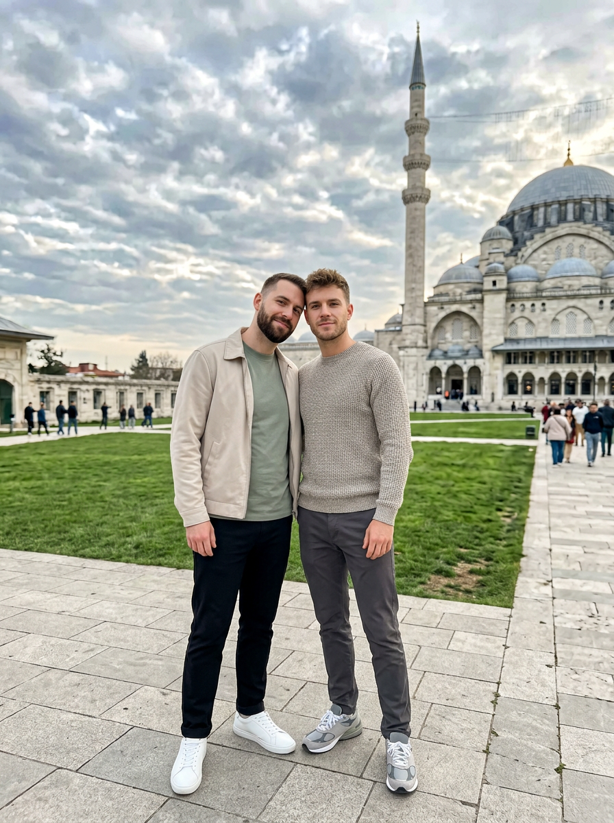 {"image_type":"photograph","genre":"lifestyle portrait","composition":{"framing":"tight foreground portrait with subjects occupying left and center frame, background architecture on right","camera_angle":"slightly elevated arm-length selfie angle","perspective":"wide-angle smartphone lens perspective","subject_positioning":"male subject on left slightly behind, male subject centered in front","cropping":"mid-chest crop with extended arm ","depth":"moderate depth of field; subjects sharp, background softly detailed"},"subjects":[{"gender_presentation":"male","approximate_age":"mid-20s to early-30s","pose":"leaning head toward partner, relaxed smile","facial_expression":"warm, subtle smile","hair":{"hair":{"style":"short, neatly trimmed"}},"facial_hair":{"type":"full beard","density":"medium","grooming":"clean and shaped"},"clothing":{"outerwear":"light beige jacket","innerwear":"sage green crewneck shirt","style":"casual minimalist"}},{"gender_presentation":"male","approximate_age":"early-20s to late-20s","pose":"slightly angled face toward camera, chin slightly raised","facial_expression":"confident neutral expression","hair":{"hair":{"style":"short, tousled textured cut"}},"facial_hair":{"type":"light stubble","density":"sparse","grooming":"neat"},"grooming":{"base":"clean natural look","eyes":"natural features","lips":"natural features","overall_style":"polished natural"},"clothing":{"top":"knit sweater","details":"simple texture","style":"casual minimalist"}}],"environment":{"location_type":"urban outdoor historic site","background_elements":["large domed mosque","tall minaret","manicured green lawn","stone walkway","tourists in background"],"architecture_style":"Ottoman \/ Islamic classical architecture","crowd_density":"light to moderate pedestrian presence"},"lighting":{"type":"natural daylight","quality":"soft and diffused","direction":"overhead and slightly frontal","shadows":"minimal, soft-edged","time_of_day":"late afternoon"},"color_palette":{"dominant_colors":["soft gray","beige","white","muted green"],"skin_tones":"warm neutral","overall_tone":"calm, airy, neutral"},"weather":{"sky":"overcast with textured clouds","atmosphere":"cool and mild"},"technical_details":{"camera_type":"smartphone","lens":"wide-angle front-facing camera","focus":"face detection autofocus","sharpness":"high on subjects","noise":"minimal","exposure":"well-balanced with preserved highlights"},"artistic_style":{"aesthetic":"clean, modern lifestyle","mood":"romantic, relaxed, travel-inspired","visual_story":"couple capturing a candid moment at a cultural landmark"},"post_processing":{"color_grading":"natural with slight warmth","contrast":"moderate","retouching":"smoothing, subtle enhancement","filters":"minimal or none"},"background_depth_and_separation":{"subject_separation":"achieved through proximity and framing rather than strong blur","background_clarity":"recognizable but not distracting"},"overall_style_tags":["travel selfie","couple portrait","soft natural light","urban tourism","romantic casual"]}
