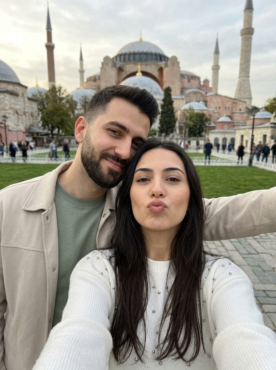 {"image_type":"photograph","genre":"lifestyle portrait","composition":{"framing":"tight foreground portrait with subjects occupying left and center frame, background architecture on right","camera_angle":"slightly elevated arm-length selfie angle","perspective":"wide-angle smartphone lens perspective","subject_positioning":"male subject on left slightly behind, female subject centered in front","cropping":"mid-chest crop with extended arm ","depth":"moderate depth of field; subjects sharp, background softly detailed"},"subjects":[{"gender_presentation":"male","approximate_age":"mid-20s to early-30s","pose":"leaning head toward partner, relaxed smile","facial_expression":"warm, subtle smile","hair":{"color":"dark brown","style":"short, neatly trimmed"},"facial_hair":{"type":"full beard","density":"medium","grooming":"clean and shaped"},"clothing":{"outerwear":"light beige jacket","innerwear":"sage green crewneck shirt","style":"casual minimalist"}},{"gender_presentation":"female","approximate_age":"early-20s to late-20s","pose":"slightly angled face toward camera, chin slightly raised","facial_expression":"soft confident pout \/ neutral expression","hair":{"color":"dark brown","length":"long","style":"loose, straight with slight natural wave"},"makeup":{"base":"smooth matte foundation","eyes":"defined brows, subtle eyeliner, neutral eyeshadow","lips":"matte rose- lipstick","overall_style":"polished natural glam"},"clothing":{"top":"white knit sweater","details":"small metallic bead embellishments","style":"soft, elegant casual"}}],"environment":{"location_type":"urban outdoor historic site","background_elements":["large domed mosque","tall minaret","manicured green lawn","stone walkway","tourists in background"],"architecture_style":"Ottoman \/ Islamic classical architecture","crowd_density":"light to moderate pedestrian presence"},"lighting":{"type":"natural daylight","quality":"soft and diffused","direction":"overhead and slightly frontal","shadows":"minimal, soft-edged","time_of_day":"late afternoon"},"color_palette":{"dominant_colors":["soft gray","beige","white","muted green"],"skin_tones":"warm neutral","overall_tone":"calm, airy, neutral"},"weather":{"sky":"overcast with textured clouds","atmosphere":"cool and mild"},"technical_details":{"camera_type":"smartphone","lens":"wide-angle front-facing camera","focus":"face detection autofocus","sharpness":"high on subjects","noise":"minimal","exposure":"well-balanced with preserved highlights"},"artistic_style":{"aesthetic":"clean, modern lifestyle","mood":"romantic, relaxed, travel-inspired","visual_story":"couple capturing a candid moment at a cultural landmark"},"post_processing":{"color_grading":"natural with slight warmth","contrast":"moderate","retouching":"light skin smoothing, subtle enhancement","filters":"minimal or none"},"background_depth_and_separation":{"subject_separation":"achieved through proximity and framing rather than strong blur","background_clarity":"recognizable but not distracting"},"overall_style_tags":["travel selfie","couple portrait","soft natural light","urban tourism","romantic casual"]}