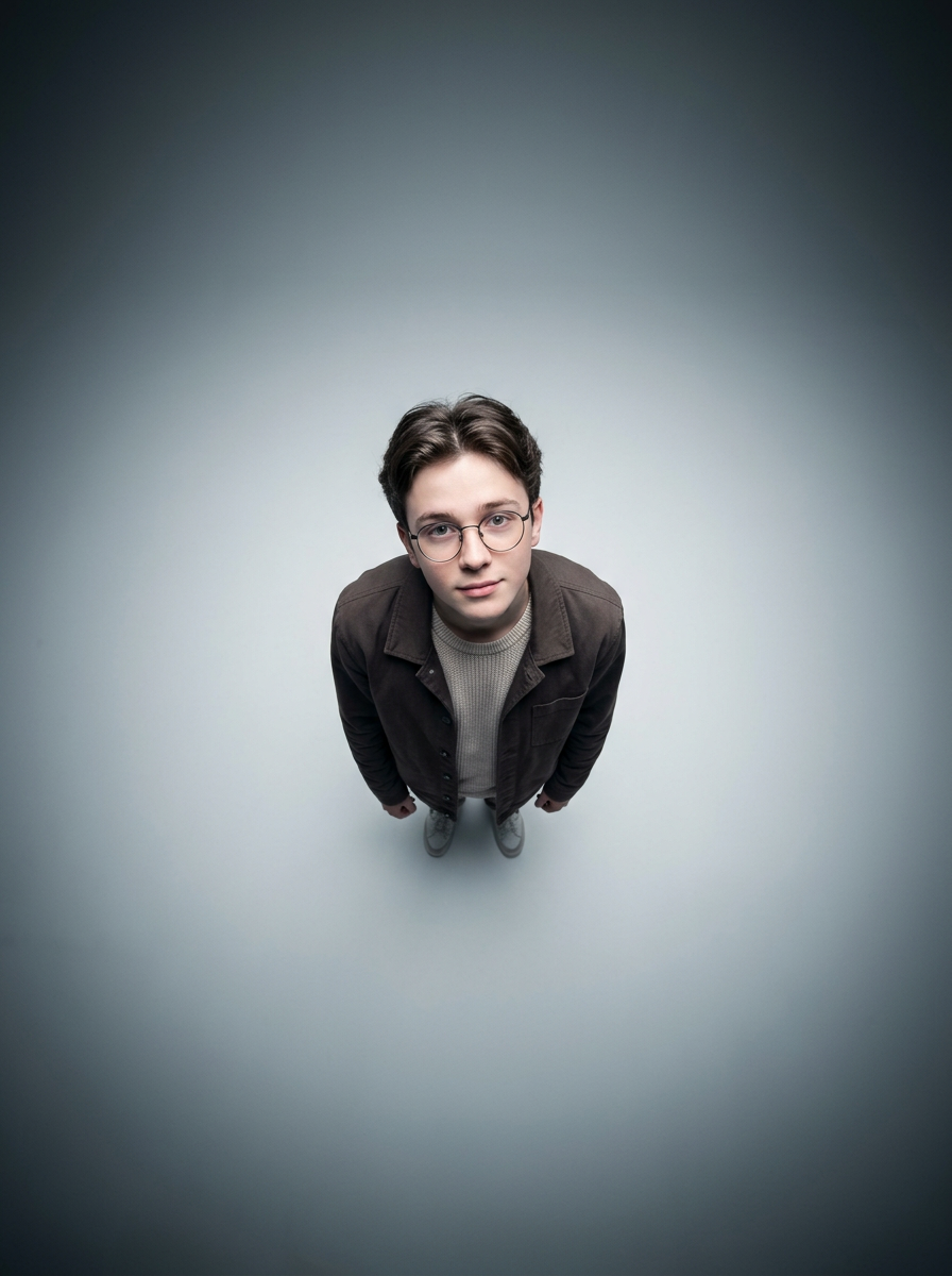 {"image_type":"photographic portrait","style":"studio portrait, cinematic, minimalist","composition":{"orientation":"portrait","framing":"full body from extreme high angle","subject_position":"centered","camera_angle":"top-down (bird\u2019s-eye \/ overhead)","lens_distortion":"strong wide-angle perspective exaggeration","negative_space":"extensive surrounding empty space","perspective":"dramatic overhead with subject looking up"},"subject":{"count":1,"description":" with glasses","pose":"standing upright, shoulders slightly forward, arms relaxed","expression":"soft, introspective, mildly curious","gaze":"looking directly up at the camera","accessories":["round eyeglasses"],"clothing":{"outerwear":"dark brown jacket","innerwear":"light-colored knit or textured shirt","style":"casual, understated"}},"facial_details":{"features":"rounded face, soft jawline","emotion":"calm, thoughtful","eye_emphasis":"enhanced by glasses and upward gaze"},"lighting":{"type":"studio lighting","setup":"top-centered soft light with gradual falloff","contrast":"low to moderate","shadows":"subtle shadows beneath chin and body","vignette":"strong radial vignette darkening toward edges"},"color":{"palette":["cool gray","charcoal","muted brown","soft beige"],"temperature":"cool-neutral","saturation":"low","mood":"quiet, contemplative"},"background":{"environment":"studio","surface":"smooth seamless floor","gradient":"radial gradient from light center to dark edges","distractions":"none"},"technical_details":{"camera_type":"digital","lens":"ultra-wide or fisheye-style wide-angle","depth_of_field":"deep (entire subject in focus)","sharpness":"high center sharpness with slight edge softness","noise":"minimal","post_processing":["contrast shaping","cool color grading","vignette enhancement","perspective exaggeration"]},"artistic_elements":{"concept":"isolation and vulnerability through scale and perspective","visual_metaphor":"small subject surrounded by vast empty space","aesthetic_influences":["editorial portrait photography","modern studio minimalism","cinematic overhead compositions"]},"typography":{"presence":false},"overall_mood":" , introspective, slightly surreal","intended_use":["editorial portrait","conceptual photography reference","AI image generation style guide"]}