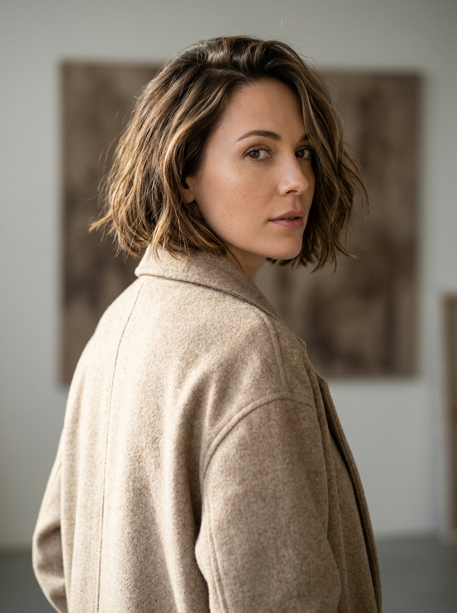{"image_type":"portrait_photography","composition":{"framing":"medium close-up","orientation":"vertical","subject_position":"subject centered slightly right, body turned away with head rotated back toward camera","crop":"cropped at mid-back, full head visible","perspective":"eye-level","pose":"three-quarter back view with over-the-shoulder gaze","negative_space":"soft, minimal negative space on right edge with background"},"subject":{"gender_presentation":"model","age_range":"young adult","skin_tone":"light, neutral-warm","facial_expression":"neutral, calm, introspective","gaze_direction":"looking slightly past the camera","hair":{"style":"short layered bob","length":"jaw to neck length","texture":"naturally tousled, slightly wavy","volume":"medium with airy lift","parting":"asymmetrical side-swept fringe","color":"medium brown with subtle warm highlights"},"facial_features":{"eyebrows":"natural, medium thickness","eyes":"soft almond shape","makeup":"minimal, natural finish","skin_finish":"matte with subtle natural texture"}},"wardrobe":{"garment_type":"coat or structured jacket","fit":"relaxed, slightly oversized","fabric":"textured woven wool or wool-blend","color":"light beige \/ cream","style":"minimalist, modern, understated"},"lighting":{"type":"natural light","direction":"soft side light from left","quality":"diffused, low contrast","shadow_characteristics":"gentle shadows with smooth falloff","highlight_behavior":"subtle highlights on cheekbone and hair strands"},"color_palette":{"dominant_colors":["beige","warm brown","soft white"],"accent_colors":["muted taupe"," tones"],"saturation":"low to moderate","overall_tone":"warm-neutral, earthy"},"background":{"environment":"studio or interior setting","elements":"blurred rectangular artwork or panel behind subject","depth_of_field":"shallow, background softly out of focus","color":"muted brown and off-white","texture":"smooth with subtle painterly blur"},"technical_details":{"camera_type":"DSLR or mirrorless","lens_estimate":"50mm\u201385mm portrait lens","aperture_estimate":"wide aperture (approximately f\/2\u2013f\/2.8)","sharpness":"sharp focus on face and hair","noise":"minimal","white_balance":"warm, natural"},"artistic_style":{"genre":"fashion editorial portrait","mood":"soft, intimate, understated","aesthetic":"modern minimalist, effortless elegance","stylistic_influences":["editorial fashion photography","natural light portraiture"],"retouching_level":"light, natural retouching preserving skin texture"},"typography":{"presence":"none"},"overall_impression":{"visual_focus":"hair texture and facial profile","emotion":"quiet confidence and calm introspection","use_case":["fashion editorial","hair styling reference","portrait inspiration"]}}