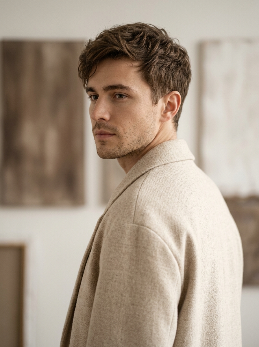 {"image_type":"portrait_photography","composition":{"framing":"medium close-up","orientation":"vertical","subject_position":"subject centered slightly right, body turned away with head rotated back toward camera","crop":"cropped at mid-back, full head ","perspective":"eye-level","pose":"three-quarter back view with over-the-shoulder gaze","negative_space":"soft, minimal negative space on right edge with background"},"subject":{"gender_presentation":"male model","age_range":"young adult","skin_tone":"light, neutral-warm","facial_expression":"neutral, calm, introspective","gaze_direction":"looking slightly past the camera","hair":{"style":"short textured cut","length":"short, 1-2 inches on top","texture":"naturally tousled, slightly wavy","volume":"medium with textured lift","parting":"asymmetrical side part","color":"medium brown with subtle warm highlights"},"facial_features":{"eyebrows":"natural, medium thickness","eyes":"almond shape","makeup":"none, groomed skin","skin_finish":"matte with subtle natural texture and light stubble"}},"wardrobe":{"garment_type":"coat or structured jacket","fit":"relaxed, slightly oversized","fabric":"textured woven wool or wool-blend","color":"light beige \/ cream","style":"minimalist, modern, understated"},"lighting":{"type":"natural light","direction":"soft side light from left","quality":"diffused, low contrast","shadow_characteristics":"gentle shadows with smooth falloff","highlight_behavior":"subtle highlights on cheekbone and hair strands"},"color_palette":{"dominant_colors":["beige","warm brown","soft white"],"accent_colors":["muted taupe"," tones"],"saturation":"low to moderate","overall_tone":"warm-neutral, earthy"},"background":{"environment":"studio or interior setting","elements":"blurred rectangular artwork or panel behind subject","depth_of_field":"shallow, background softly out of focus","color":"muted brown and off-white","texture":"smooth with subtle painterly blur"},"technical_details":{"camera_type":"DSLR or mirrorless","lens_estimate":"50mm\u201385mm portrait lens","aperture_estimate":"wide aperture (approximately f\/2\u2013f\/2.8)","sharpness":"sharp focus on face and hair","noise":"minimal","white_balance":"warm, natural"},"artistic_style":{"genre":"fashion editorial portrait","mood":"soft, , understated","aesthetic":"modern minimalist, effortless elegance","stylistic_influences":["editorial fashion photography","natural light portraiture"],"retouching_level":"light, natural retouching preserving skin texture"},"typography":{"presence":"none"},"overall_impression":{"visual_focus":"hair texture and facial profile","emotion":"quiet confidence and calm introspection","use_case":["fashion editorial","hair styling reference","portrait inspiration"]}}