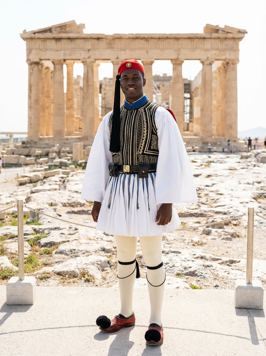 impressive and traditional model in Athens wearing a traditional Evzone uniform/Amalia dress, Parthenon in the background