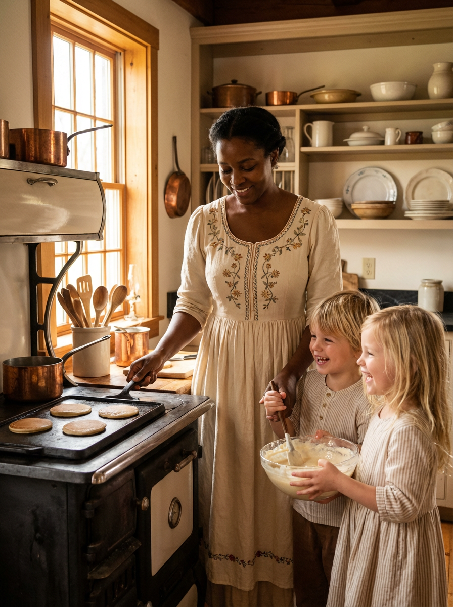 in a cozy, rustic kitchen bathed in warm, natural light, a model embodies the essence of a traditional wife. she gracefully wears a raw milkmaid dress, its fabric lightly wrinkled yet elegant, drawing on classic rural aesthetics. the dress features delicate embroidery and lace accents for an authentic touch. surrounding her are her blonde children, joyfully assisting in the pancake cooking process. the kitchen exudes a heartwarming atmosphere, with farmhouse-style wooden furniture and vintage kitchenware, while the subtle aroma of freshly cooked pancakes fills the air. the entire scene captures a harmonious blend of tradition, family, and the simple joys of life.