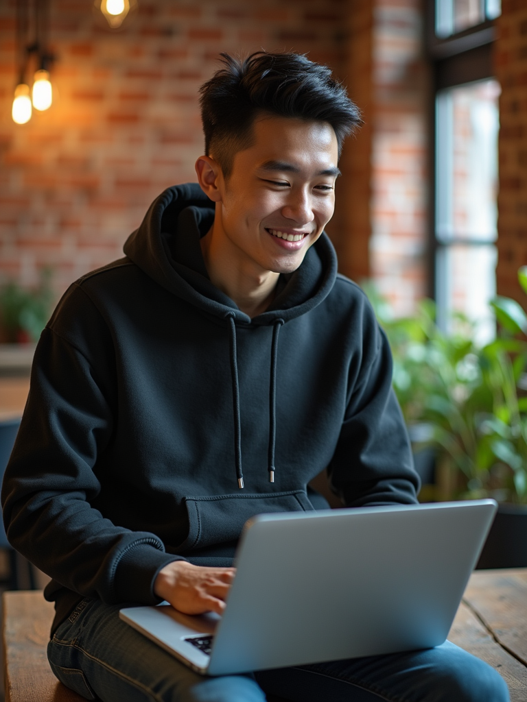 innovative model wearing designer hoodie with premium jeans working on laptop in industrial-chic office, exposed brick walls, plants, warm lighting