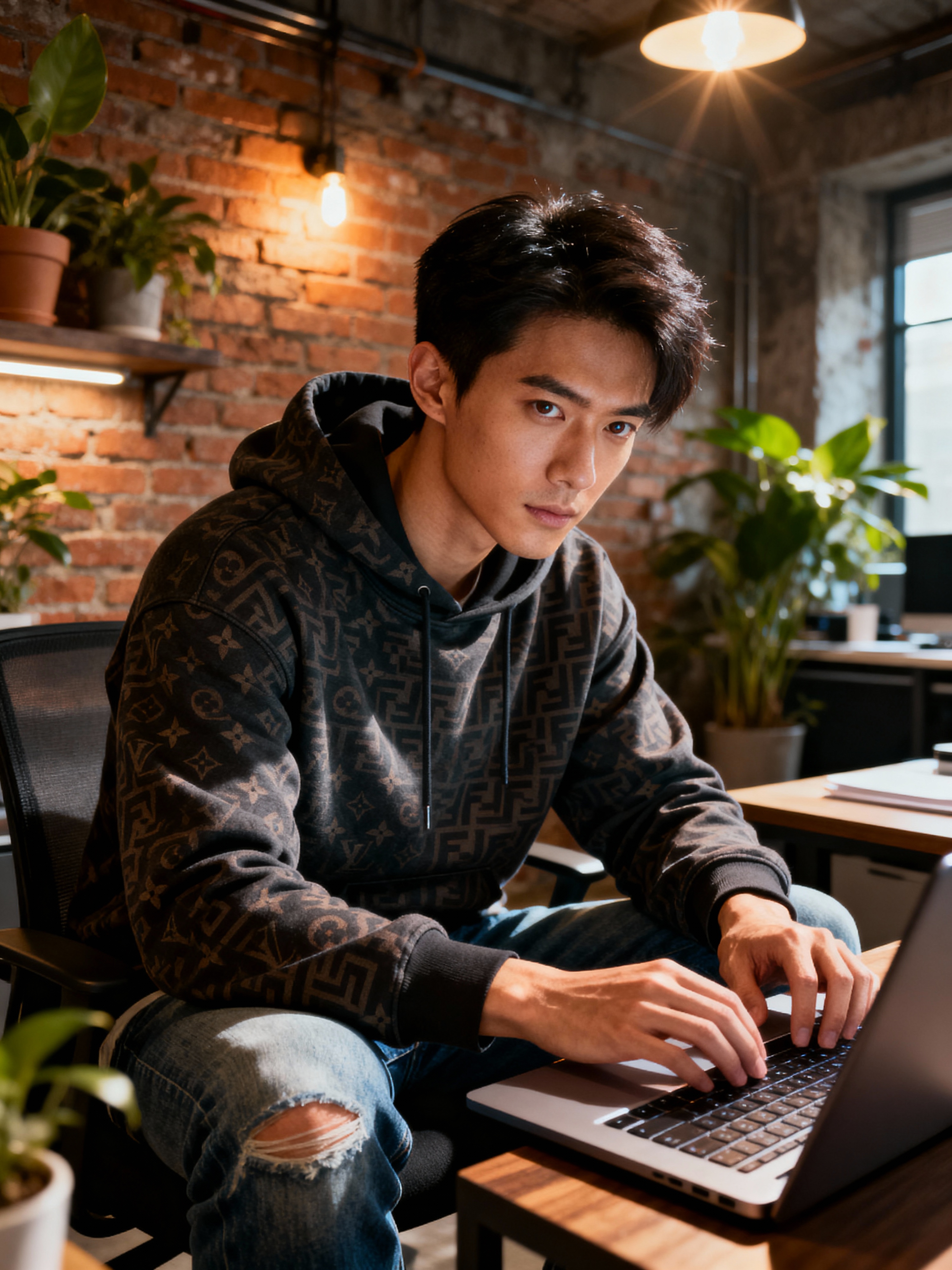 innovative model wearing designer hoodie with premium jeans working on laptop in industrial-chic office, exposed brick walls, plants, warm lighting