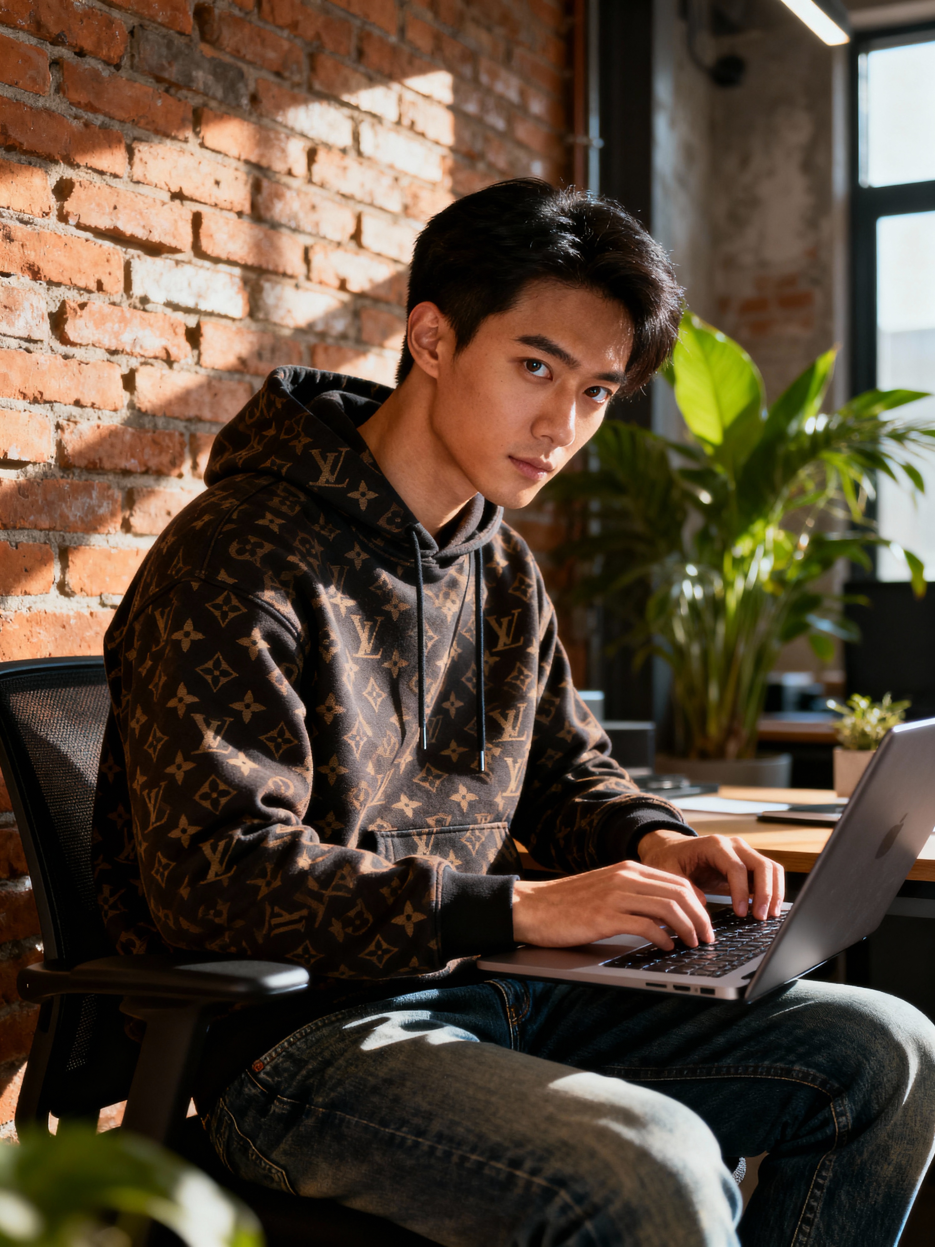 innovative model wearing designer hoodie with premium jeans working on laptop in industrial-chic office, exposed brick walls, plants, warm lighting