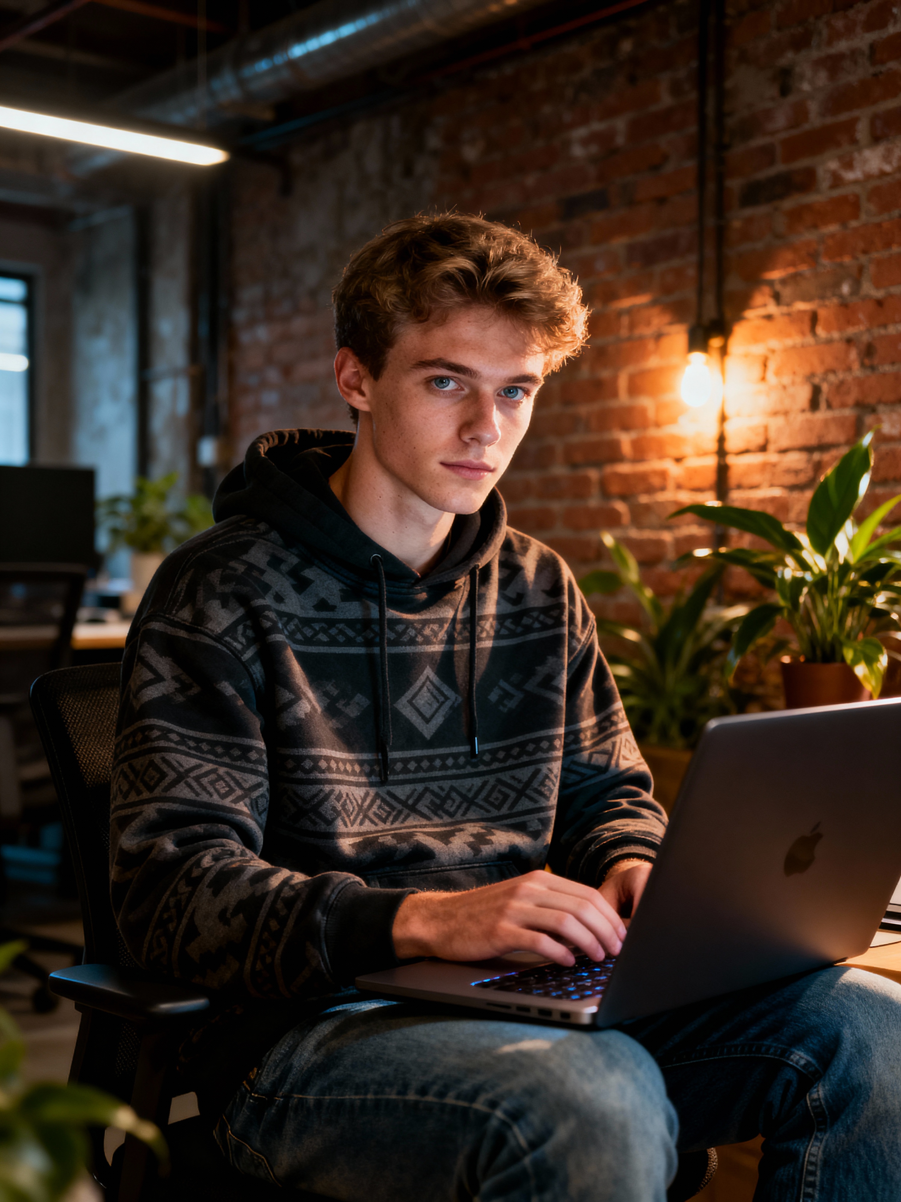 innovative model wearing designer hoodie with premium jeans working on laptop in industrial-chic office, exposed brick walls, plants, warm lighting