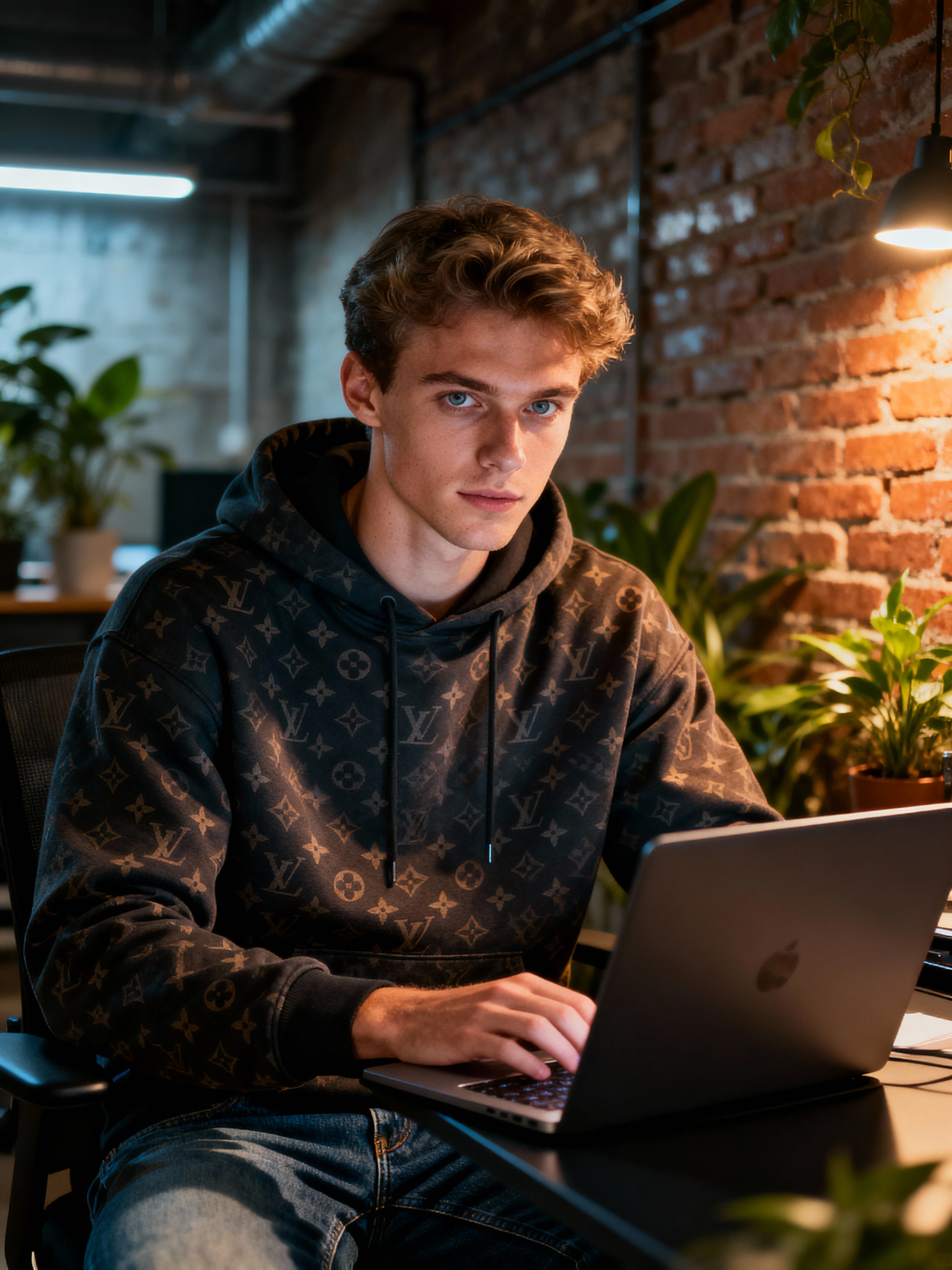 innovative model wearing designer hoodie with premium jeans working on laptop in industrial-chic office, exposed brick walls, plants, warm lighting