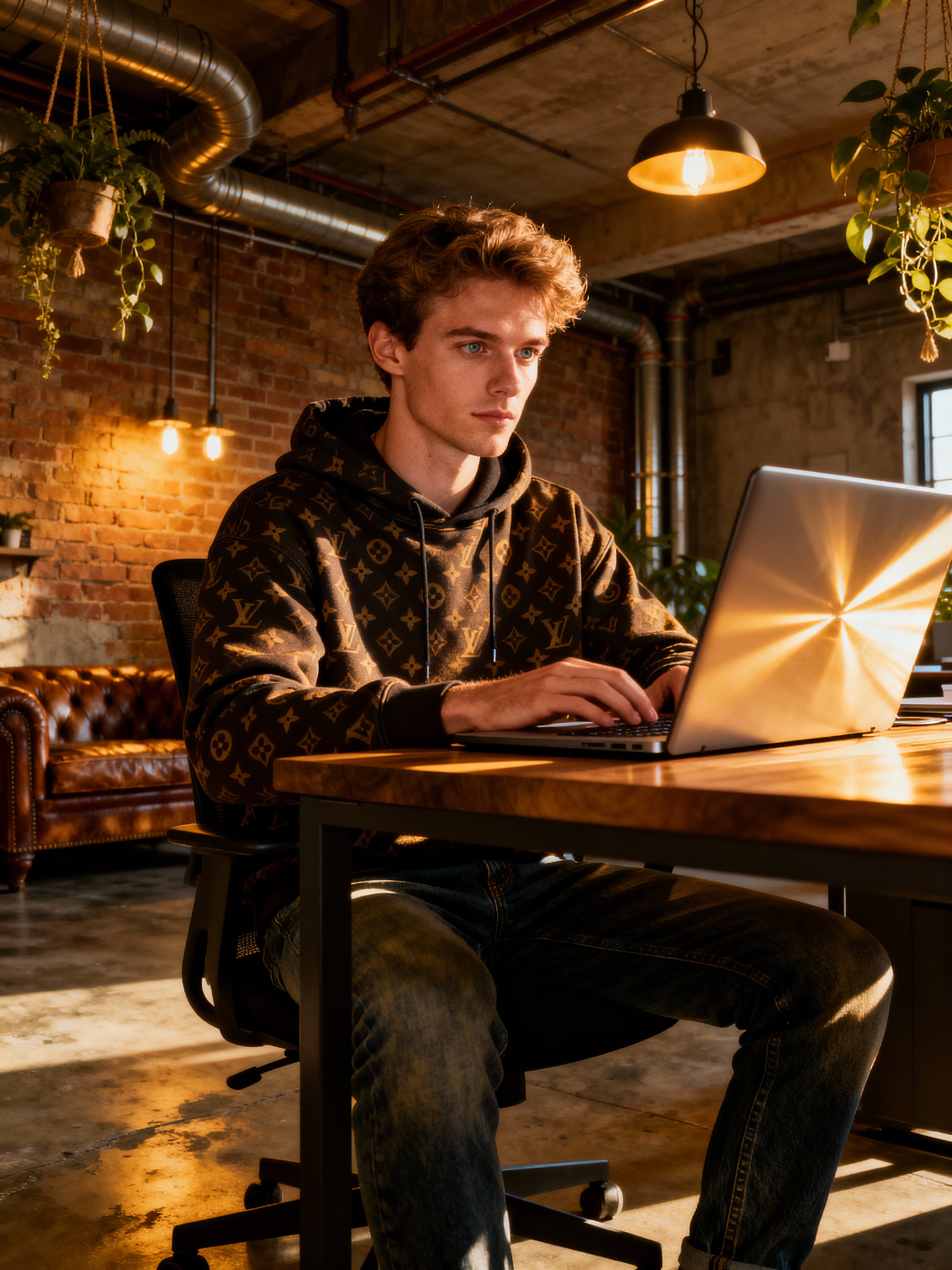 innovative model wearing designer hoodie with premium jeans working on laptop in industrial-chic office, exposed brick walls, plants, warm lighting