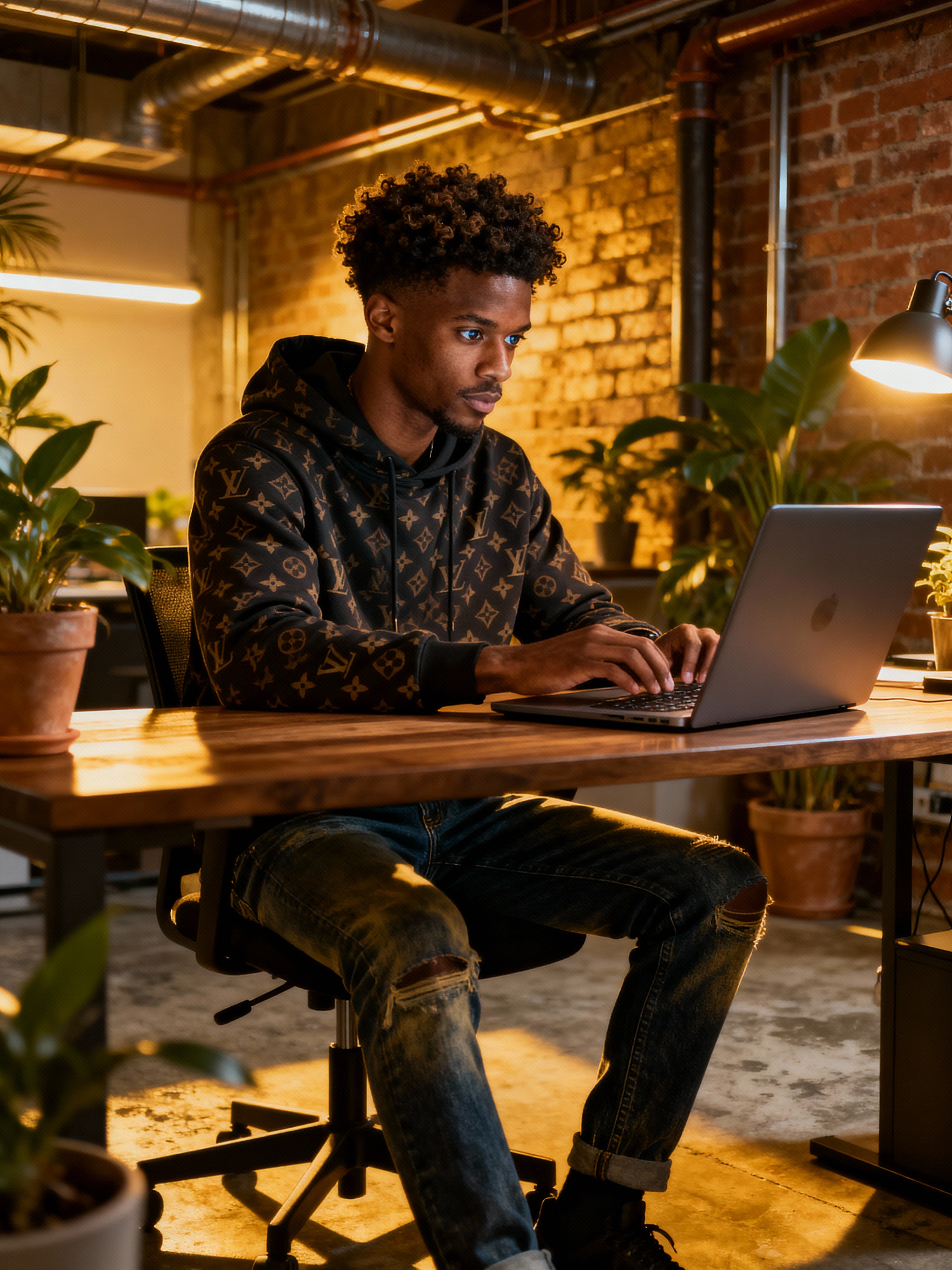 innovative model wearing designer hoodie with premium jeans working on laptop in industrial-chic office, exposed brick walls, plants, warm lighting