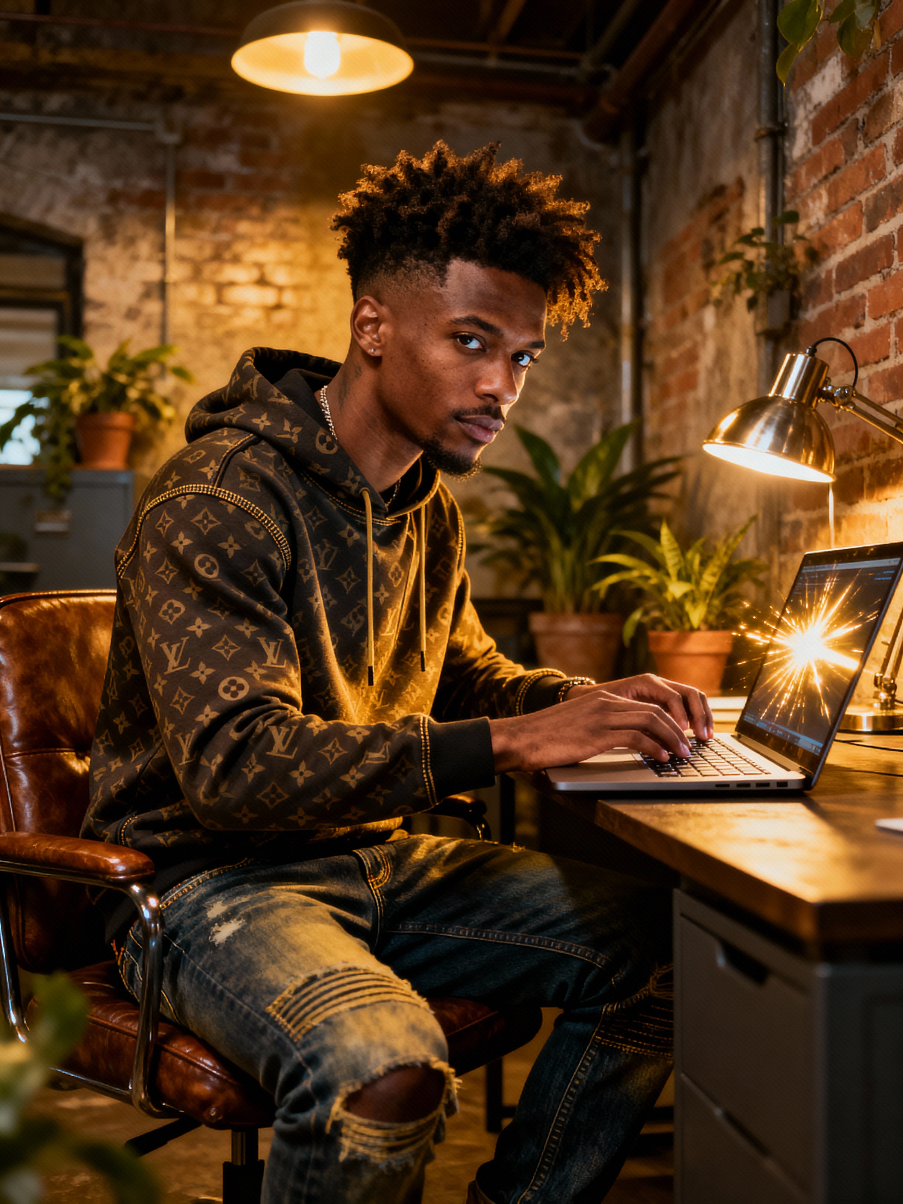 innovative model wearing designer hoodie with premium jeans working on laptop in industrial-chic office, exposed brick walls, plants, warm lighting