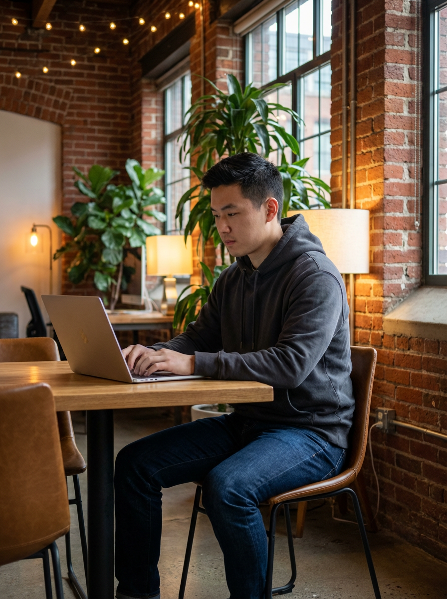 innovative model wearing designer hoodie with premium jeans working on laptop in industrial-chic office, exposed brick walls, plants, warm lighting