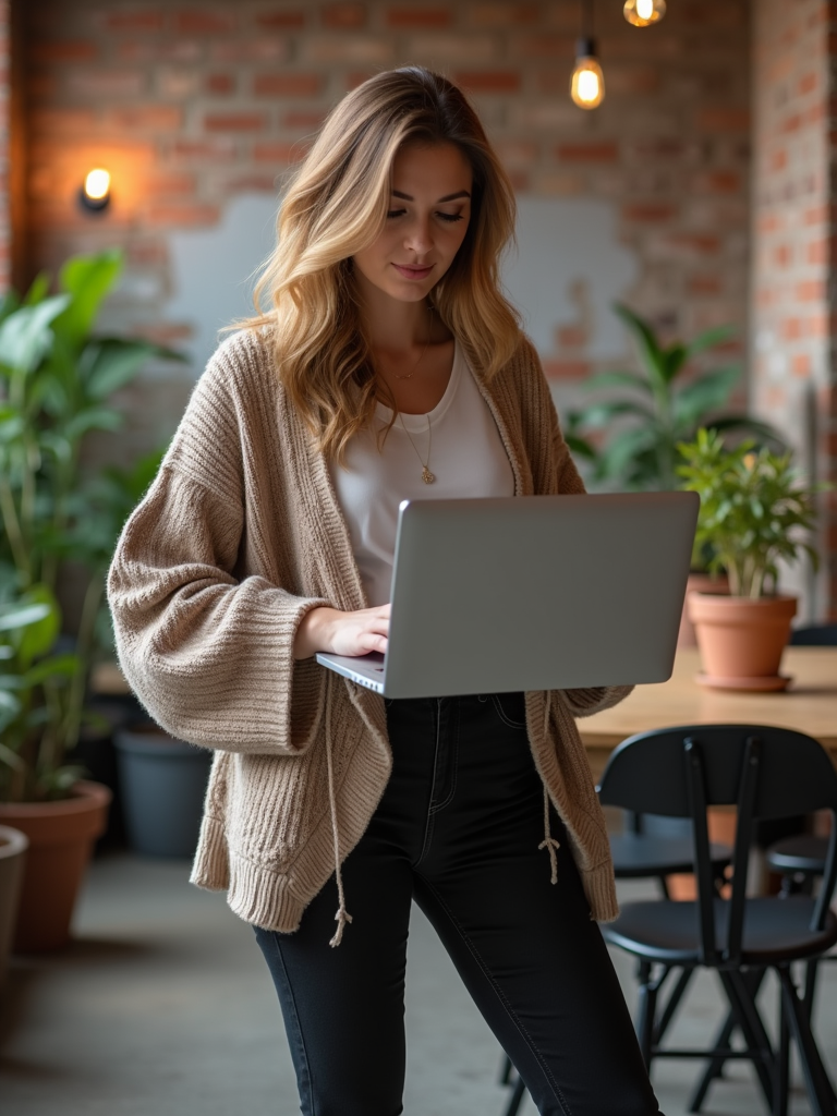 innovative model wearing stylish cardigan with slim-fit pants working on laptop in industrial-chic office, exposed brick walls, plants, warm lighting