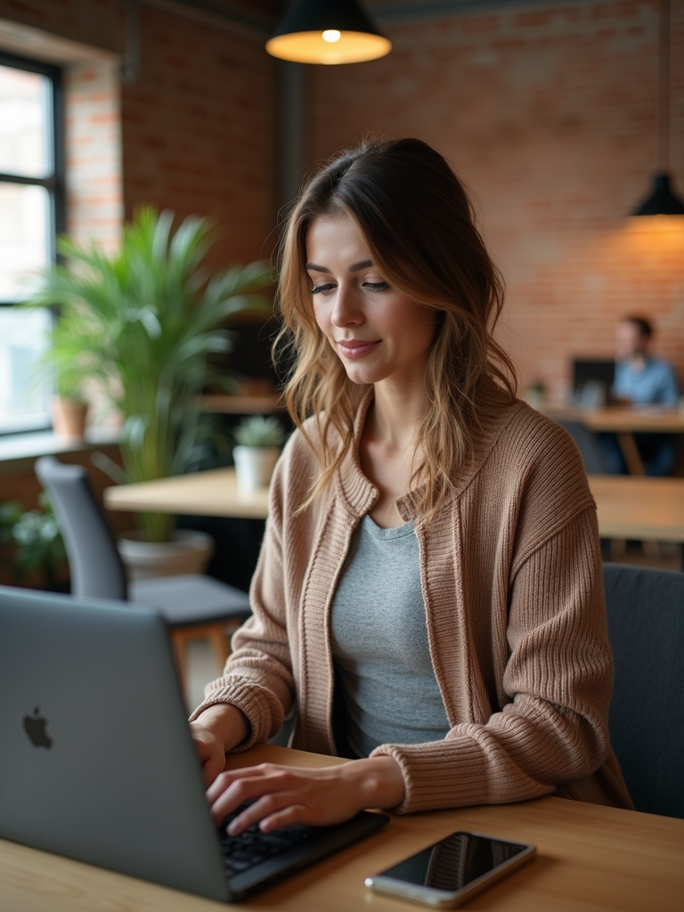 innovative model wearing stylish cardigan with slim-fit pants working on laptop in industrial-chic office, exposed brick walls, plants, warm lighting