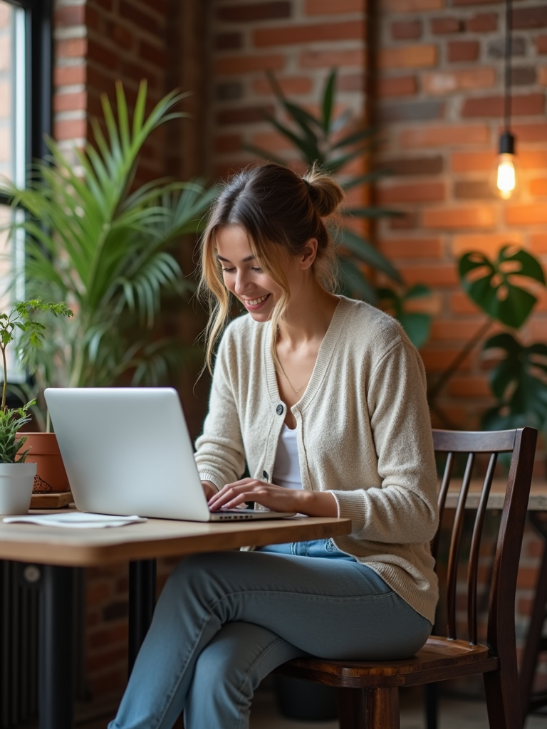 innovative model wearing stylish cardigan with slim-fit pants working on laptop in industrial-chic office, exposed brick walls, plants, warm lighting