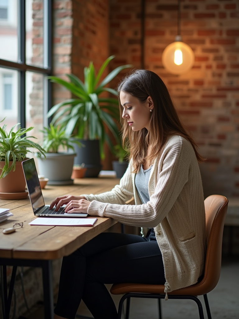 innovative model wearing stylish cardigan with slim-fit pants working on laptop in industrial-chic office, exposed brick walls, plants, warm lighting