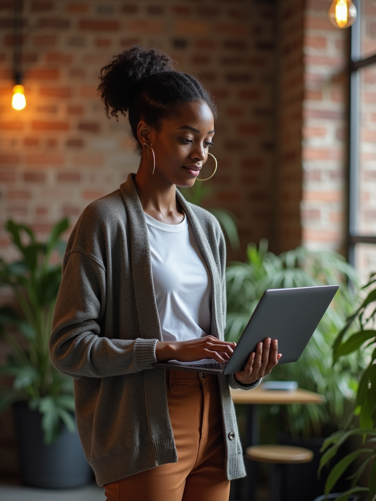 innovative model wearing stylish cardigan with slim-fit pants working on laptop in industrial-chic office, exposed brick walls, plants, warm lighting