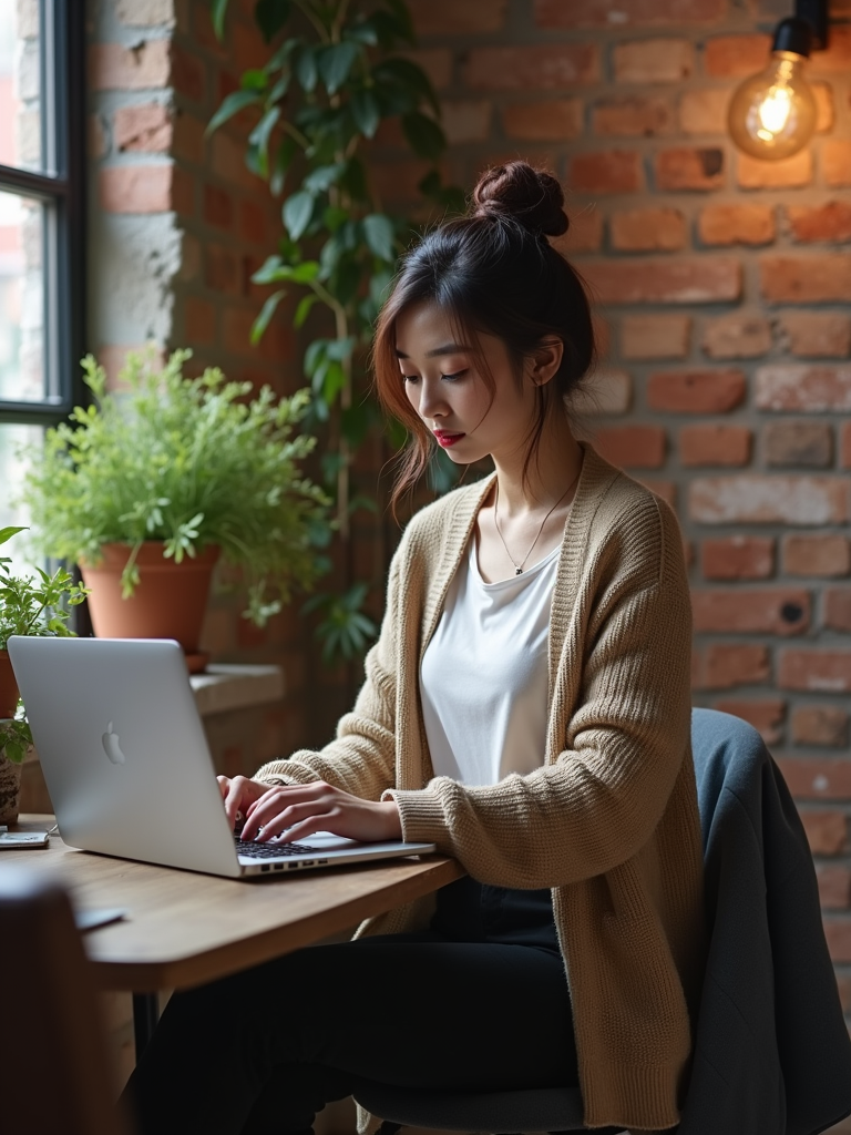 innovative model wearing stylish cardigan with slim-fit pants working on laptop in industrial-chic office, exposed brick walls, plants, warm lighting