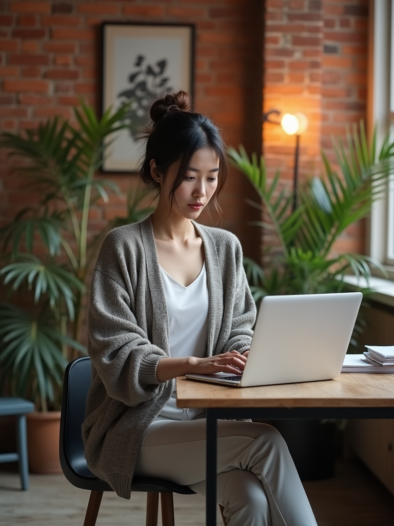 innovative model wearing stylish cardigan with slim-fit pants working on laptop in industrial-chic office, exposed brick walls, plants, warm lighting