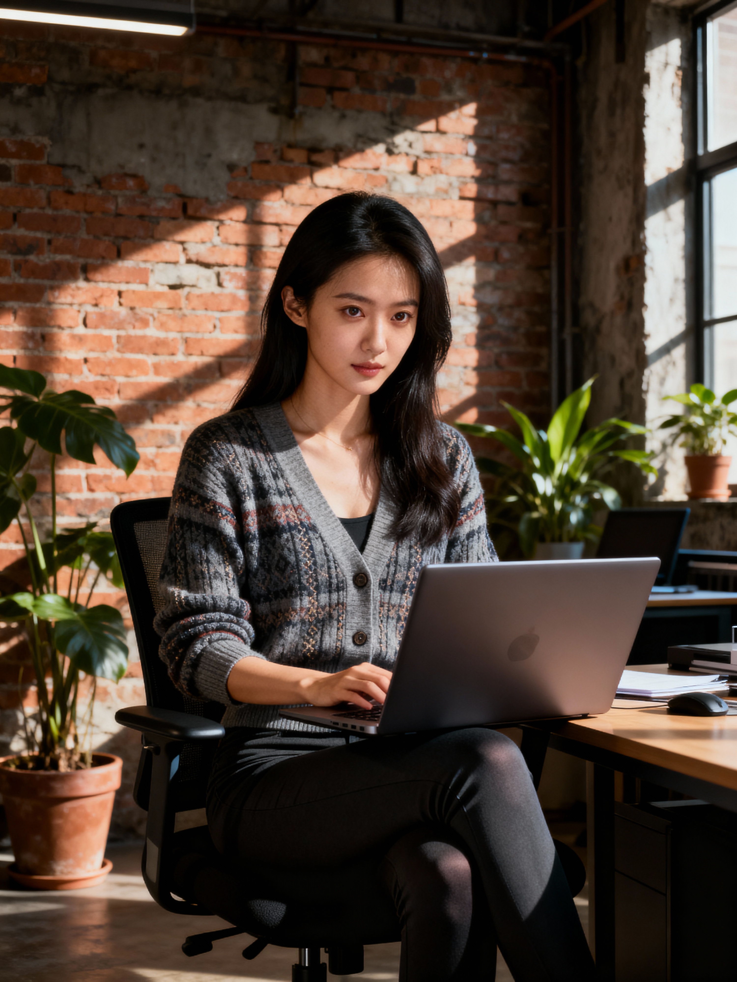 innovative model wearing stylish cardigan with slim-fit pants working on laptop in industrial-chic office, exposed brick walls, plants, warm lighting