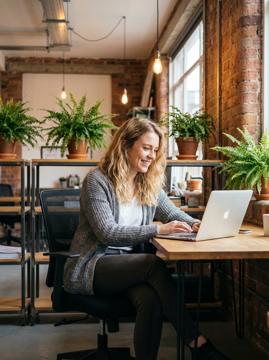 innovative model wearing stylish cardigan with slim-fit pants working on laptop in industrial-chic office, exposed brick walls, plants, warm lighting