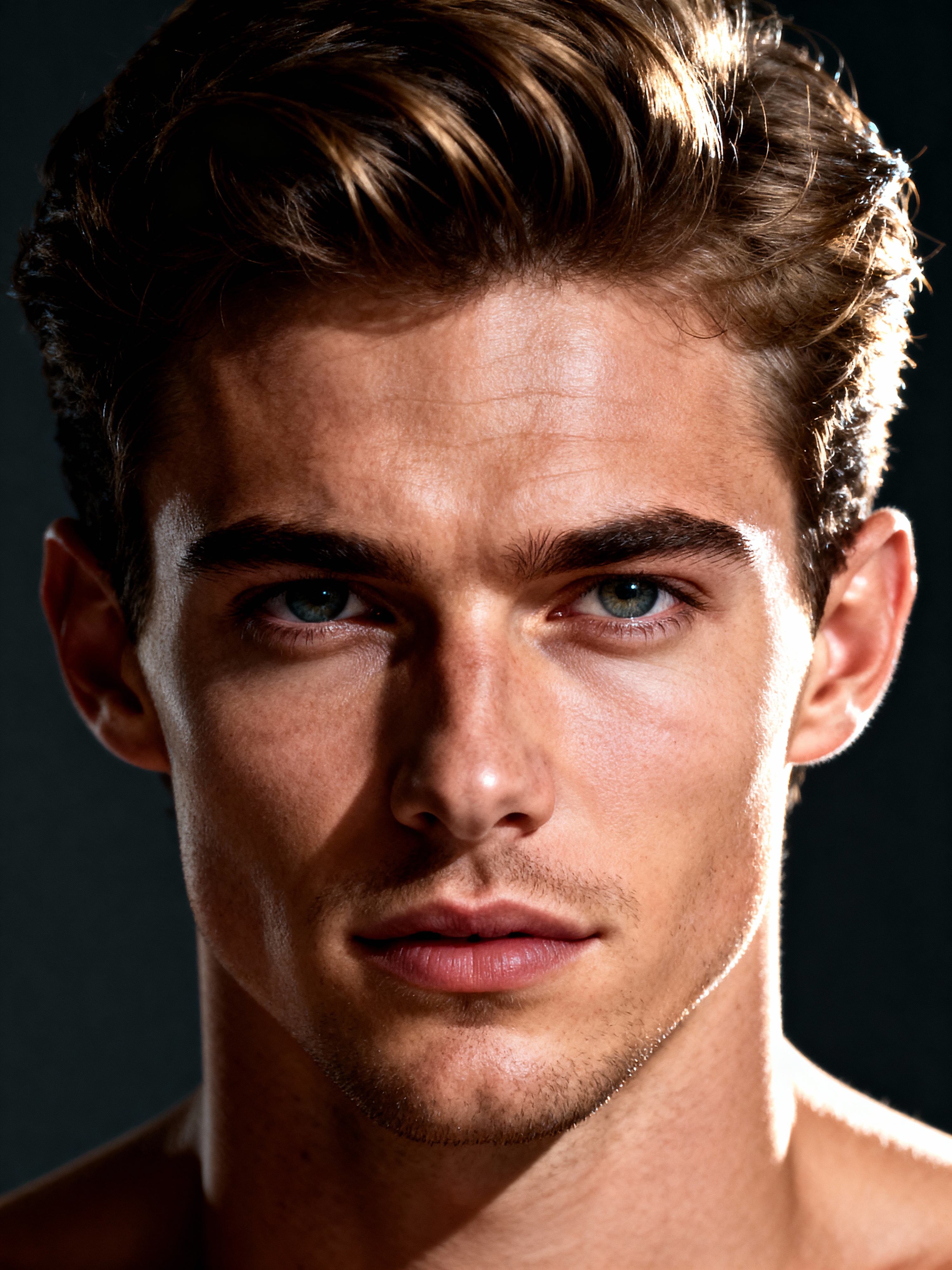 insanely beautiful model in a beauty campaign. Groomed appearance, strong features. Clean studio lighting, beauty photography.