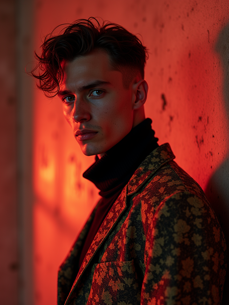 insanely beautiful model in a creative fashion editorial. Wearing creative fashion, dynamic expression. Artistic lighting, fashion magazine style.
