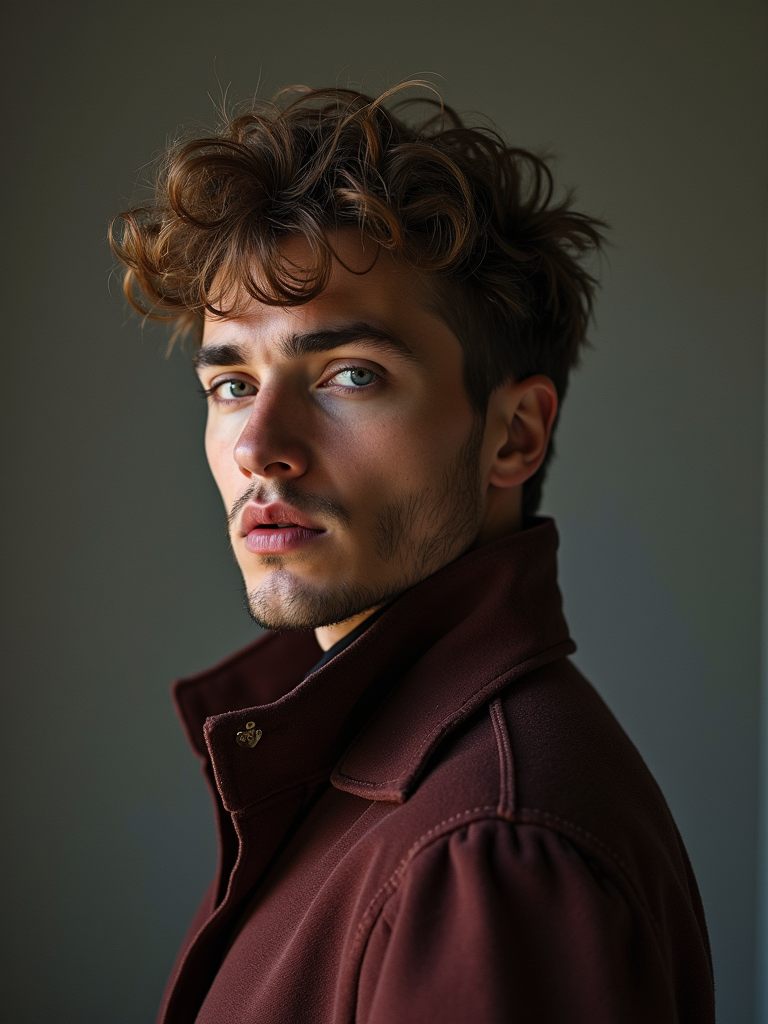 insanely beautiful model in a creative fashion editorial. Wearing creative fashion, dynamic expression. Artistic lighting, fashion magazine style.