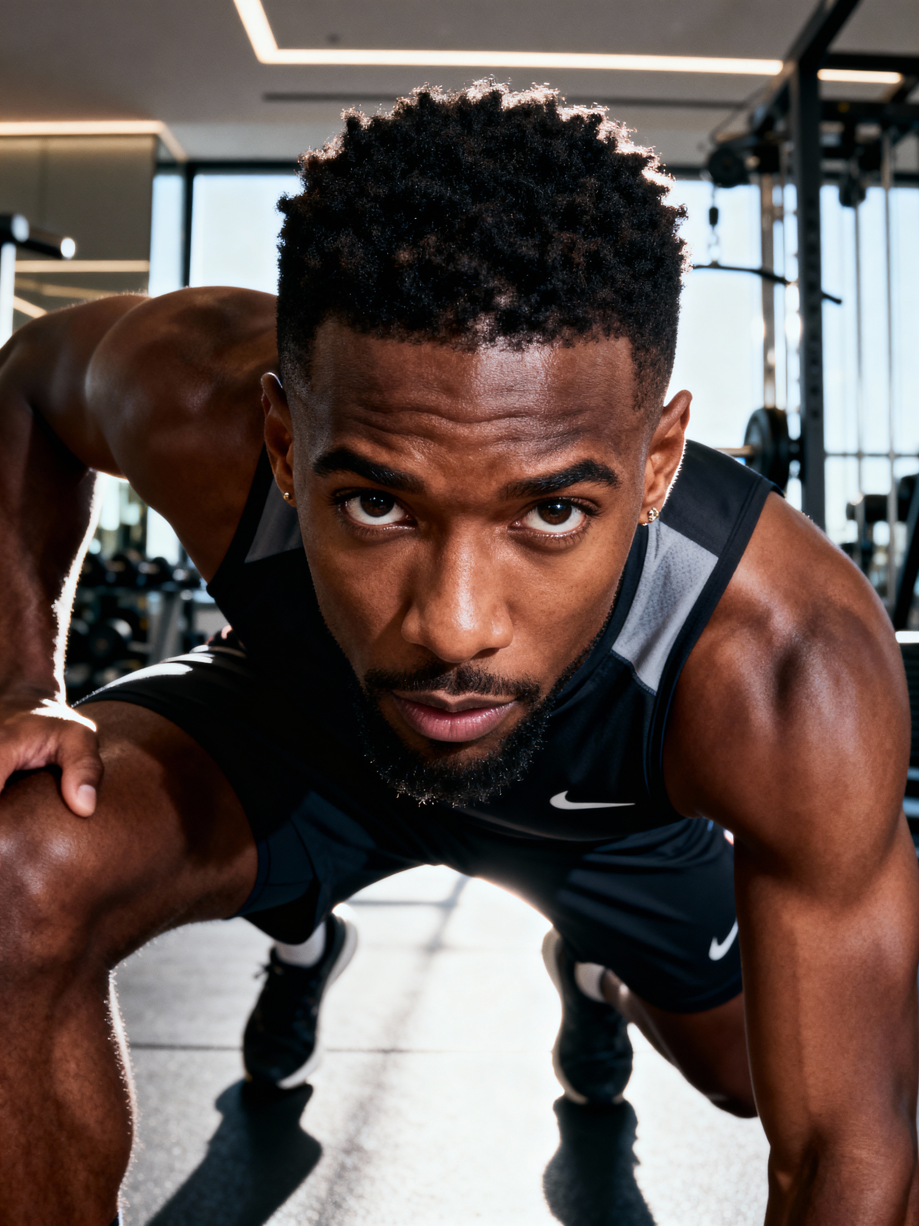 insanely beautiful model in a fitness campaign. Wearing luxury sportswear, dynamic stance. Modern gym setting, fitness photography.