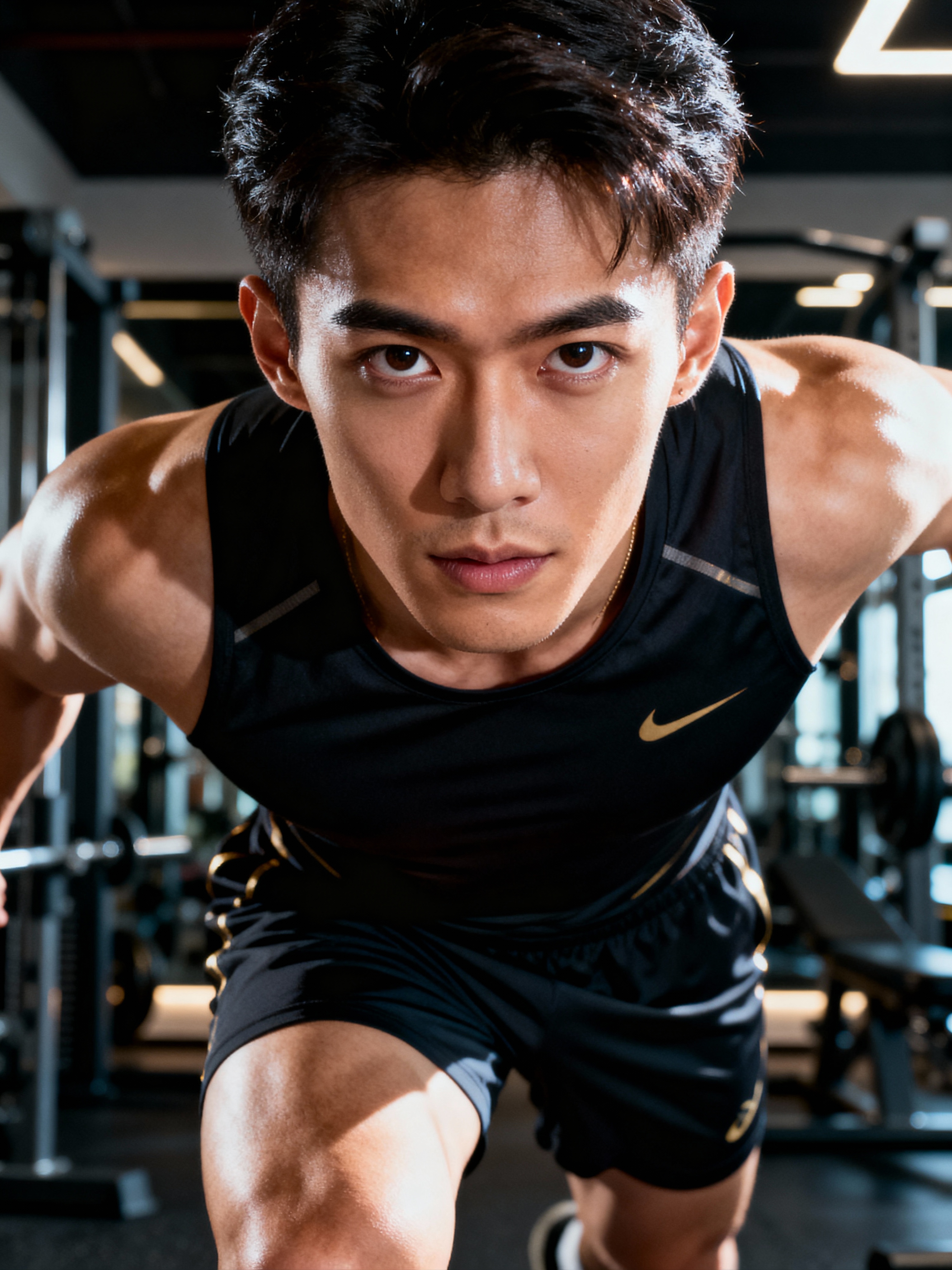 insanely beautiful model in a fitness campaign. Wearing luxury sportswear, dynamic stance. Modern gym setting, fitness photography.